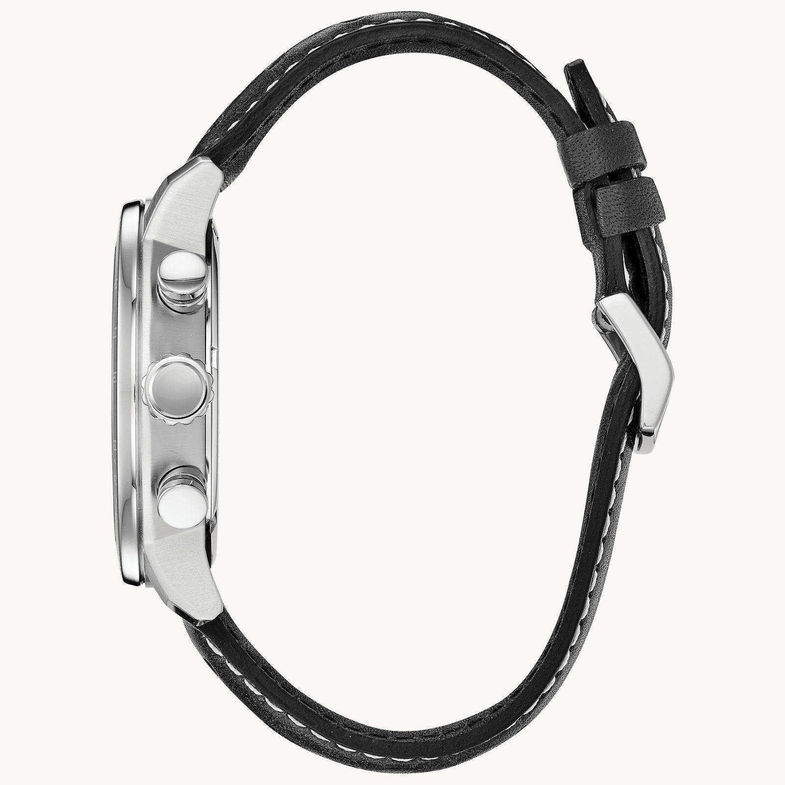 This timepiece from CITIZEN's Brycen collection incorporates inspirations of old with aspirations of new. Shown in a stainless steel case with a black bezel and black leather strap, this timepiece features a 1/5-second chronograph that measures up to 60 minutes, a tachymeter, 12/24-hour time, a screw-back case, and a spherical crystal. Case size 44 mm. Water resistant up to 100 metres.