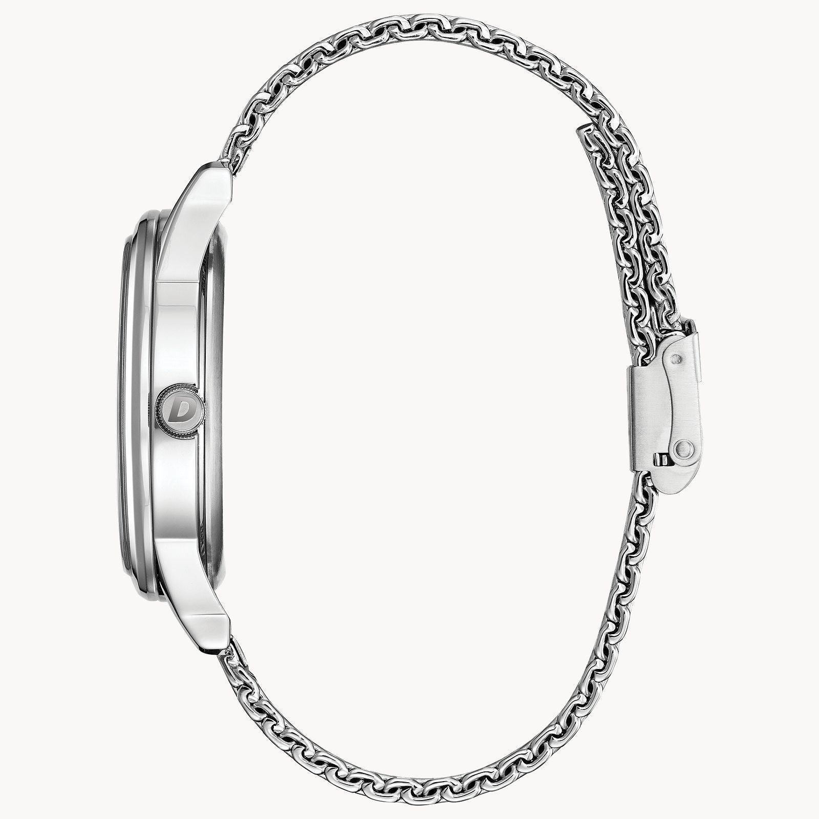Silver-tone stainless steel case with a silver-tone stainless steel mesh bracelet. Fixed silver-tone stainless steel bezel. Blue dial with silver-tone hands and Arabic numeral hour markers. Minute markers around the outer rim. Dial Type: Analog. Date display at the 3 o'clock position. One- small seconds subdials. Eco-drive movement. Scratch resistant mineral crystal. Pull / push crown. Solid case back. Round case shape. Case size: 40 mm. Water resistant at 50 meters / 165 feet. Functions: date, hour, minute, second. Casual watch style. Watch label: Japan Movt. Citizen BTW Blue Dial Mens Watch BV1110-51L.