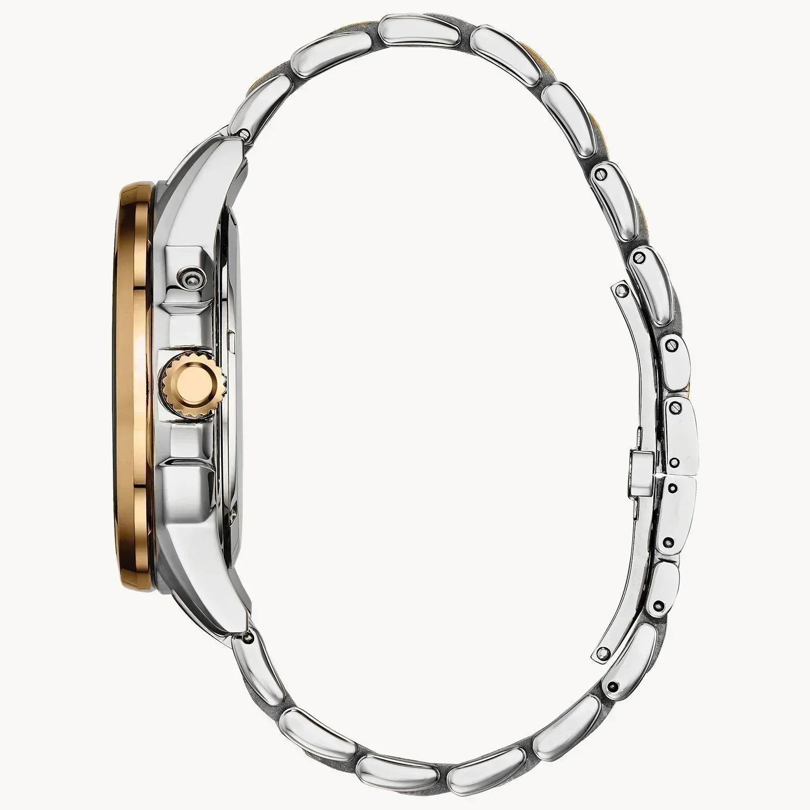 Citizen Eco-Drive round two-tone stainless steel case and bracelet, silver-tone dial, moon phase indicator, month/day/date, Mineral crystal, 44mm case, WR100, deployment clasp with push button.
