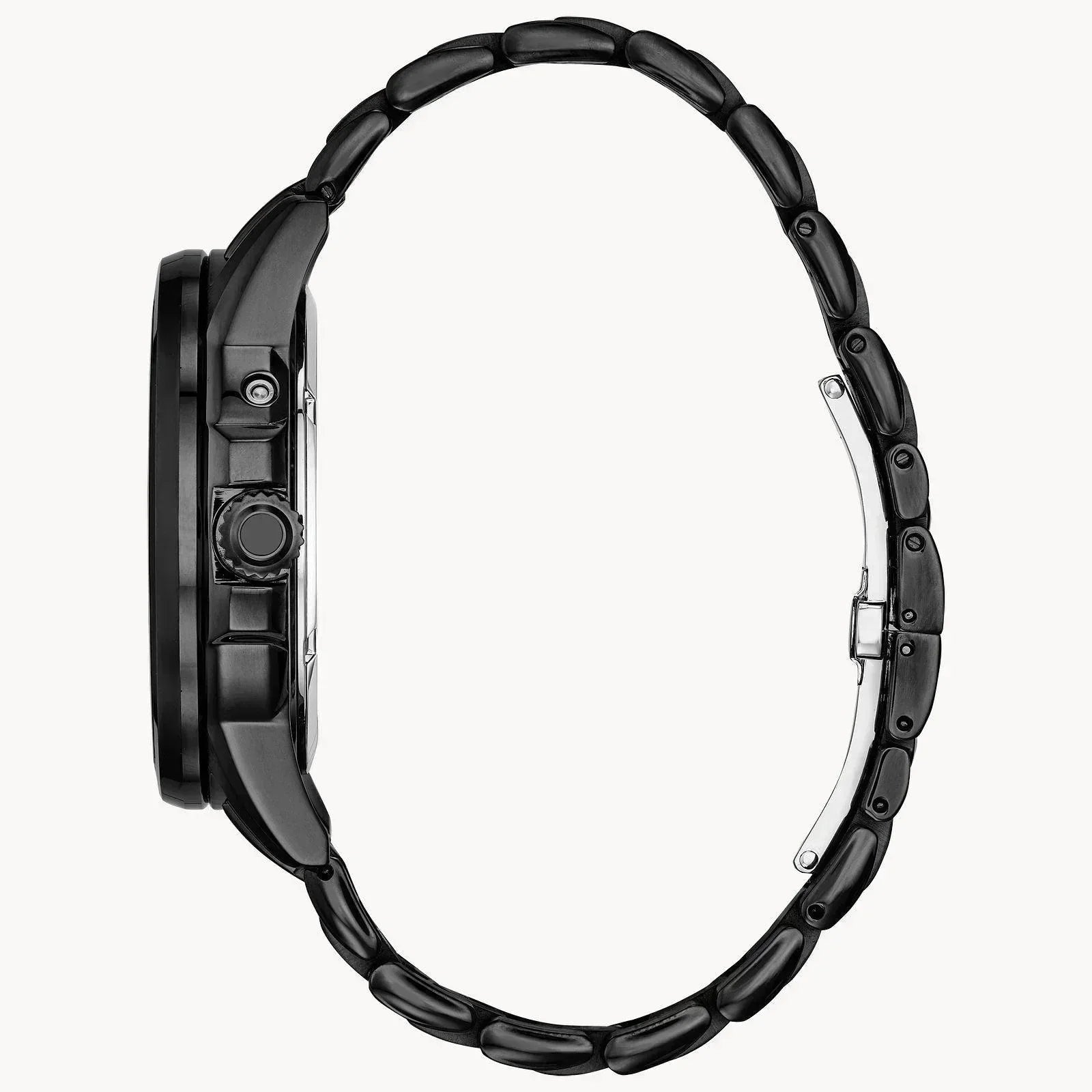 Citizen Eco-Drive round gray ion plated stainless steel case and bracelet, black dial, moon phase indicator, month/day/date, mineral crystal, 44mm case, WR100, deployment clasp with push button.