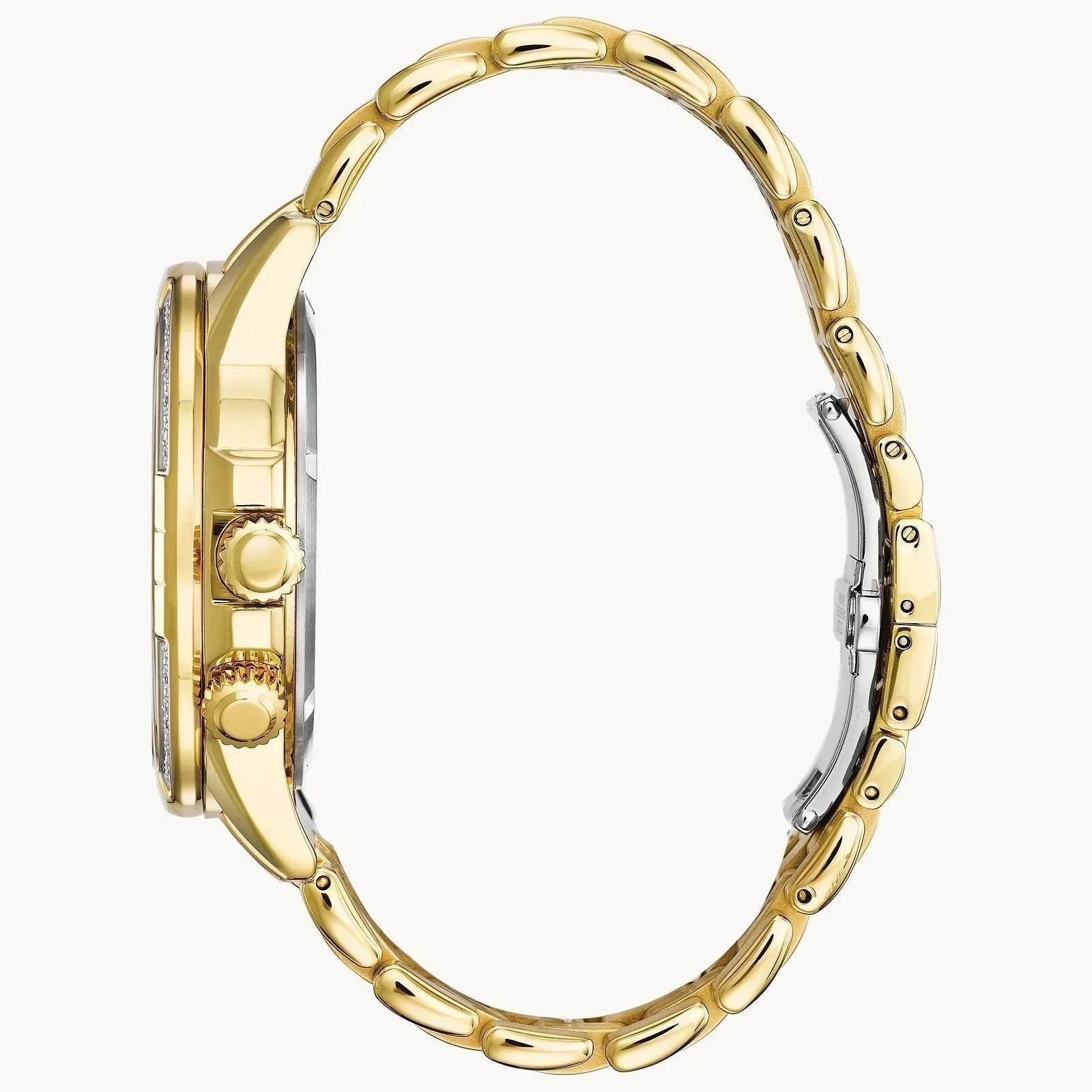 Movement Eco-Drive 8729. Functions Day/Date, 12/24-Hour Time. Band gold-tone stainless steel bracelet. Deployment clasp with push button. Case Size 44mm, case material gold-tone stainless steel, diamonds Crystal, anti-reflective Spherical Crystal. Water resistance WR100/10Bar/333ft Swimming, Marine Sports.