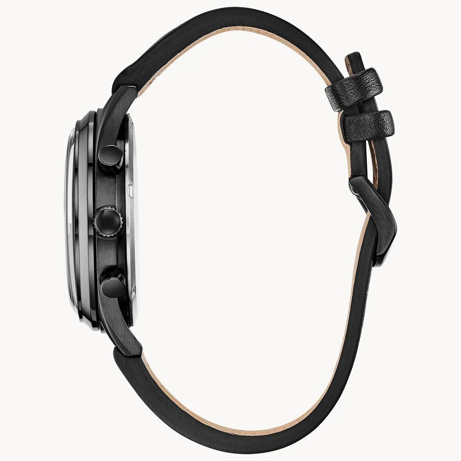 For the every day watch wearer, add a touch of classic refinement to your growing collection with the CITIZEN Chandler timepiece. This stylish watch, with grey-tone stainless steel case, black leather strap and black dial, features 1/5-second chronograph measuring up to 60 minutes, domed crystal and date. Featuring our Eco-Drive technology powered by light, any light. Never needs a battery. Case size 43 mm. Water resistant at 100 meters.