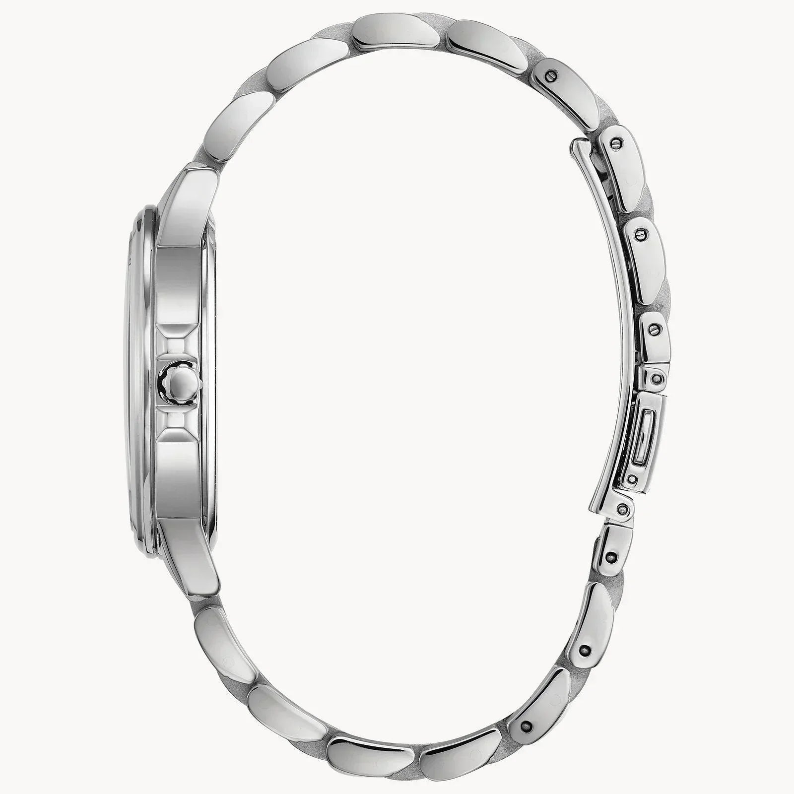 A trendsetter with a touch of sparkle. CITIZEN's Chandler collection provides clean and casual looks with a focus on everyday wear. Highlighted with Swarovski crystal indices and powered by Eco-Drive technology, this is more than just a solar watch, it's a timepiece powered by any light. This model features a stainless steel case and bracelet with radiant white Mother-of-Pearl dial. Case size 37 mm. Water resistance upto 50m.