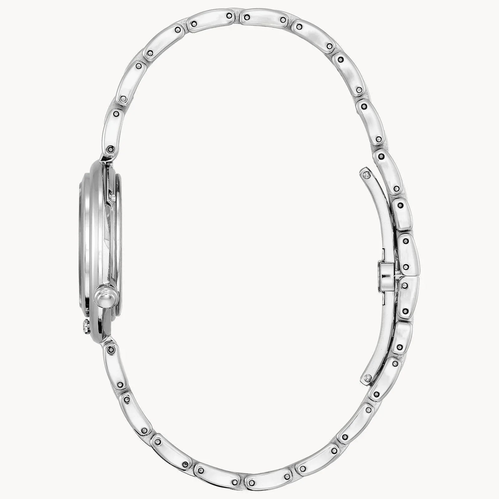 Stunning, stylish, and daring CITIZEN introduces an iconic timepiece designed especially for women. Three diamonds float whimsically along the case and beautifully complement a soft gradient white/blue mother-of-pearl dial that is adorned with 7 diamonds. Also featuring a spherical sapphire crystal, and sweeping dial motif, the stainless steel case and bracelet are feminine in design. CITIZEN L Sunrise sets the standard for timeless women's fashion. Water resistant up to 50 metres. Case size 30 mm.