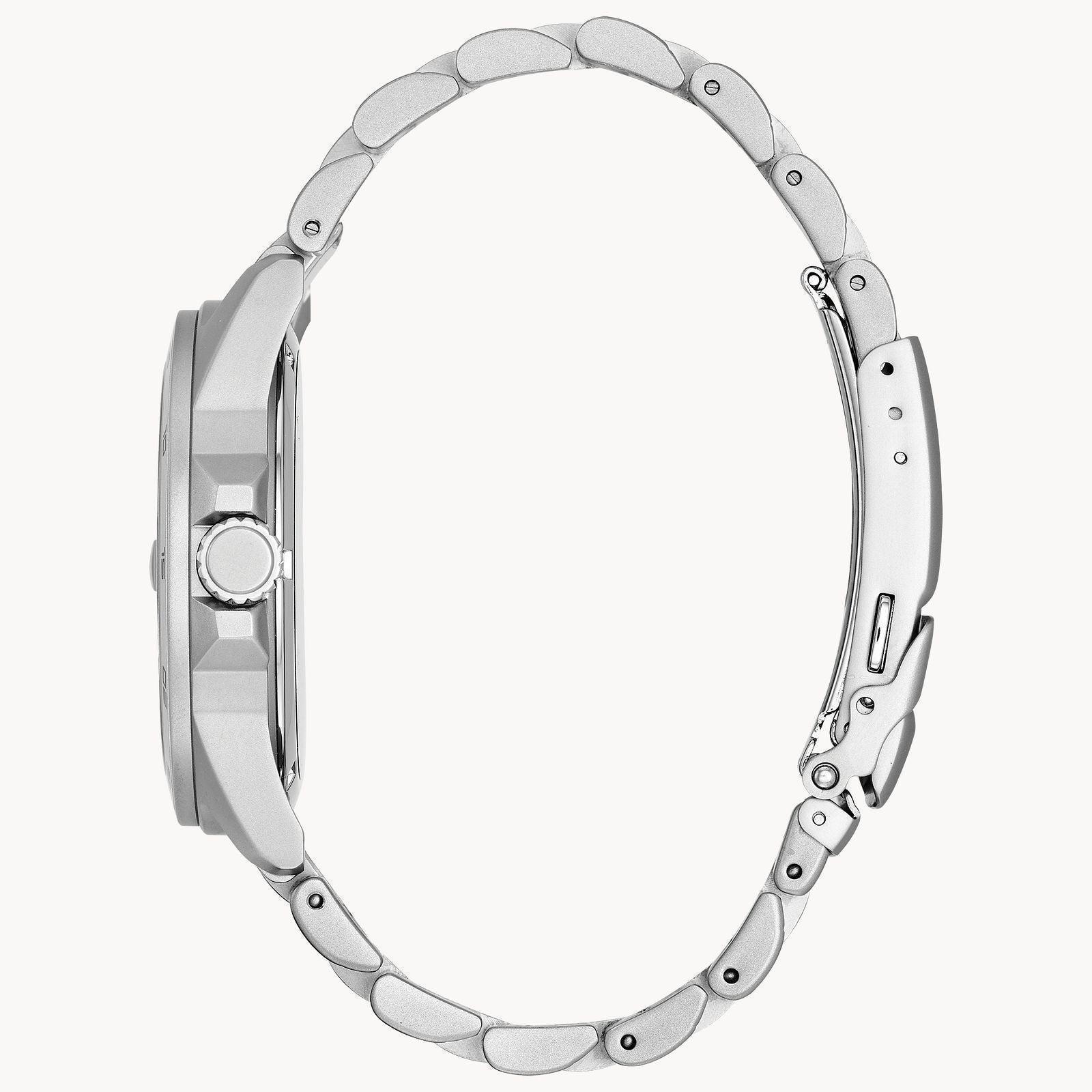 The design of this timepiece from CITIZEN's PRT collection is the perfect blend of bold accents and subtle details, worthy of every day wear. Shown in a honed stainless steel case and bracelet, this timepiece features a power reserve indicator, a screw-back case, and a cyclops date window. Water resistant up to 100 metres. Case size 42 mm.
