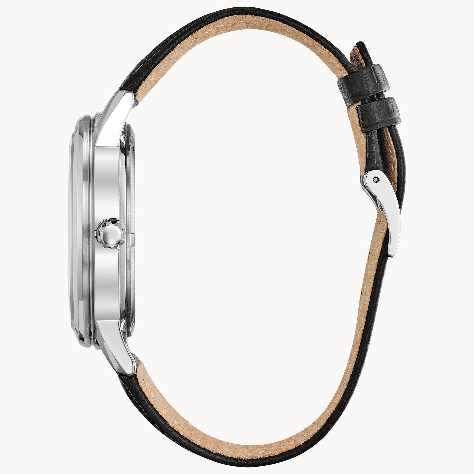 This timepiece from CITIZEN's Corso collection offers a combination of functional simplicity with a touch of timeless elegance, and is more than just a solar watch, it's a timepiece powered by any light with Eco-Drive technology. This model features a stainless steel case with a black leather strap, a sleek silver dial, a sapphire crystal, day/date display, and 12/24-hour time. Case size 44 mm. Water resistant up to 100 metres.