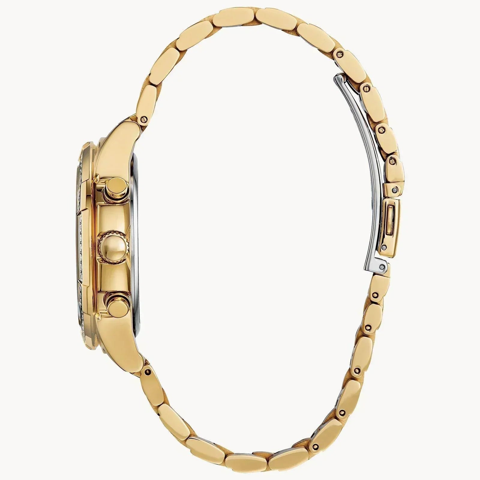 Citizen Eco-Drive round gold-tone stainless steel case and bracelet, black dial, Swarovski crystal accents, 1-second chronograph measures up to 60 minutes, 12/24 hour time, date, 42mm case, WR50, fold over clasp with push button.
