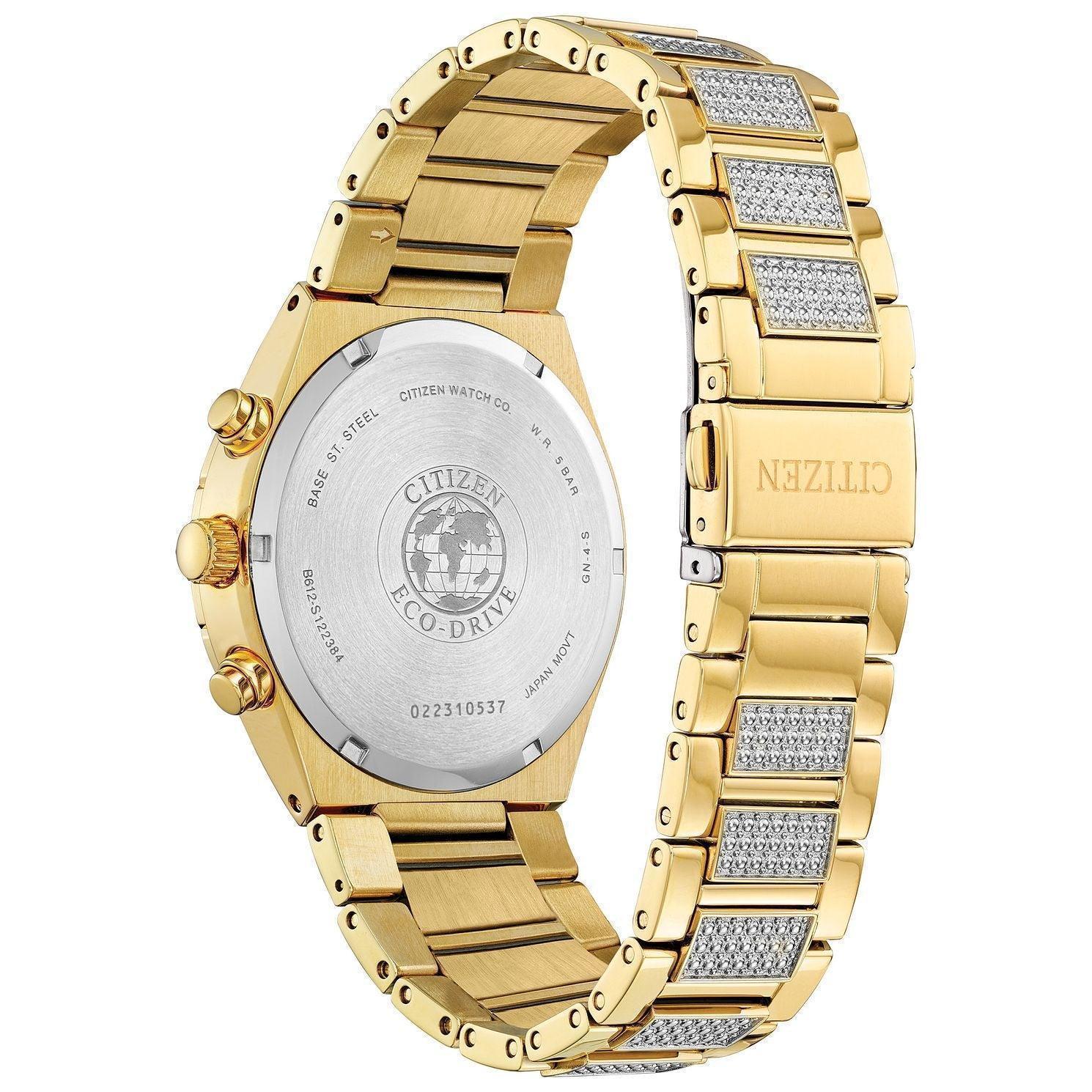 Citizen Eco-Drive round gold-tone stainless steel case and bracelet, black dial, Swarovski crystal accents, 1/5 sec chrono, 12/24-hour time, 42mm case, WR50, FCP.