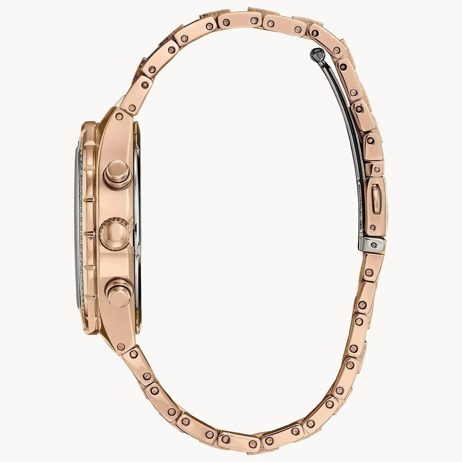 Citizen Eco-Drive round rose gold-tone stainless steel case and bracelet, black dial, Swarovski crystal accents, 1/5 sec chrono, 12/24-hour time, 42mm case, WR50, FCP.