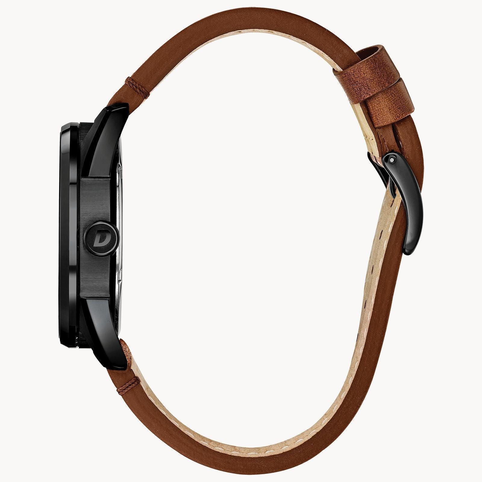 Check this out! The fresh design of this CTO timepiece from CITIZEN's DRIVE collection gives a modern look to a simple and classic style - perfect for the millennials of today. Shown in a black ion plated stainless steel case and hickory brown leather strap with a bold black dial, this timepiece features a screw-back case and day/date display. Water resistant up to 100 metres. Case size 42 mm.