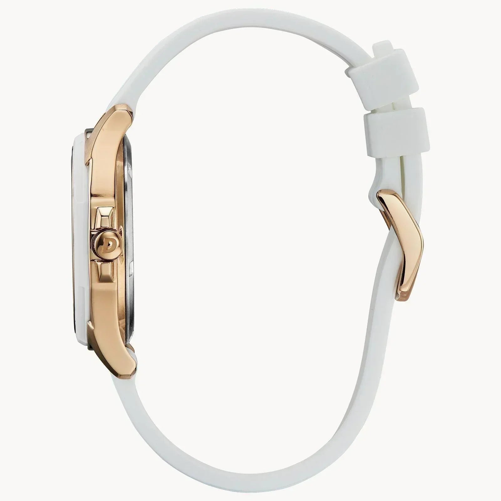 Share your fashionable point of view starting with this bold LTR timepiece from CITIZEN's DRIVE collection. A rose gold-tone stainless steel case with white silicon strap features a white Mother-of-Pearl dial and CITIZEN's proprietary chroma finishing in white on the case. Featuring our Eco-Drive technology powered by light, any light. Never needs a battery. Case size: 35 mm. Water resistant at 100 meters.
