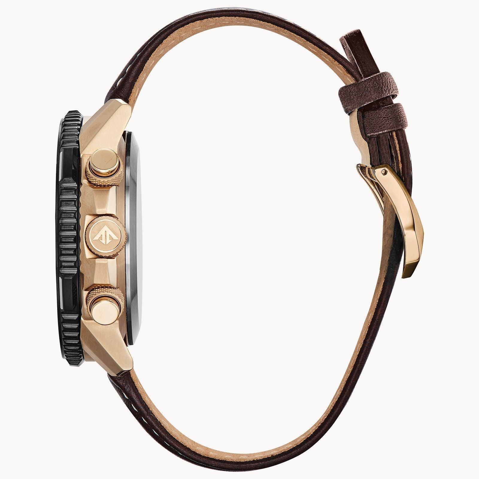 Citizen Eco-Drive round rose gold tone stainless steel case, brown leather strap, black dial atomic Timekeeping, 2 Alarm, 1/100 Sec, Chrono, Perp, Calender, power reserve indicater, Anti Reflection crystal. Case size 46 mm. Water resistance up to 200 metres, buckle.