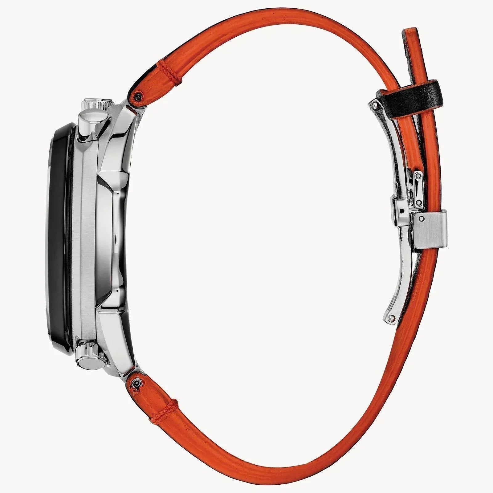 Tracking time by increment is easy with Chronograph feature. Cooking, games or Space exploration - this stopwatch does it all for you Eco-drive solar powered quartz movement with analog chronograph display and sapphire crystal dial window Alarm, chronograph, water-resistant Black leather strap and stainless steel case with orange dial Water resistant to 20 ATM / 200 meters / 660 feet : suitable for professional marine activity serious surface water sports and skin diving. Case size 45 mm.