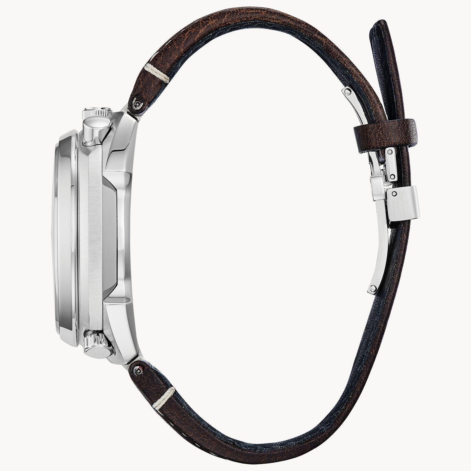Paying homage to a retro 1973 CITIZEN Bullhead model, the newly modernized CITIZEN PROMASTER Limited Edition Tsuno Chrono Racer showcases a unique case styling, trendy colour combinations and is sure to stand out on your wrist. Limited to 1,973 pieces globally with its hand assembled movement, it features a 1/5-second flyback chronograph measuring up to 12 hours, an alarm, a power reserve indicator, a tachymeter, a screw-back case, and sapphire crystal. Shown here in a stainless steel case, a dark brown leather strap with white constrast stitching, and a parchment and black dial. Featuring our Eco-Drive technology powered by light, any light. Never needs a battery. Case size 45 mm. Water resistant up to 200 metres.