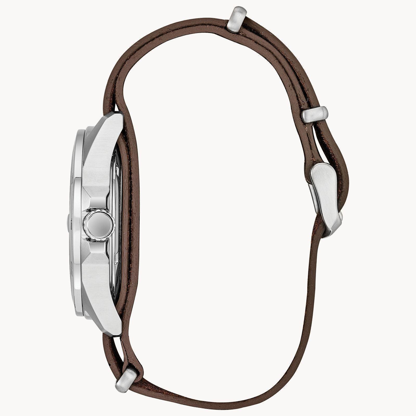 Silver-tone stainless steel case with a brown leather strap. Fixed silver-tone stainless steel bezel. Taupe dial with luminous silver-tone hands and index hour markers. Arabic numerals mark the 6, 9 and 12 o'clock positions. minute markers around the outer rim. Dial Type: Analog. Date display at the 3 o'clock position. Power reserve indicator subdials. Citizen Caliber Eco-Drive J850 eco-drive movement with an 8-months power reserve. Scratch resistant mineral crystal. Pull / push crown. Solid case back. Round case shape, case size: 42 mm, case thickness: 11 mm. Band width: 20 mm. Tang clasp. Water resistant at 100 meters / 330 feet. Functions: date, hour, minute, second, power reserve indicator. Sport watch style. Citizen PRT Taupe Dial Brown Leather Mens Watch AW7039-01H.