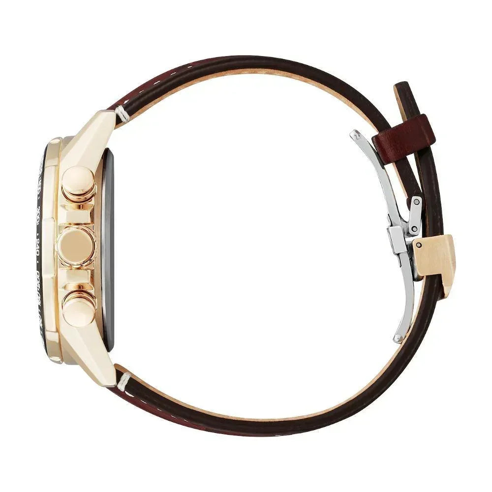 Citizen Eco-Drive round rose gold-tone stainless steel case, brown leather strap, green dial, atomic timekeeping in 43 world cities, world timer, perpetual calendar, power reserve indicator, chronograph, sapphire crystal, 43mm case, WR200, HDP.