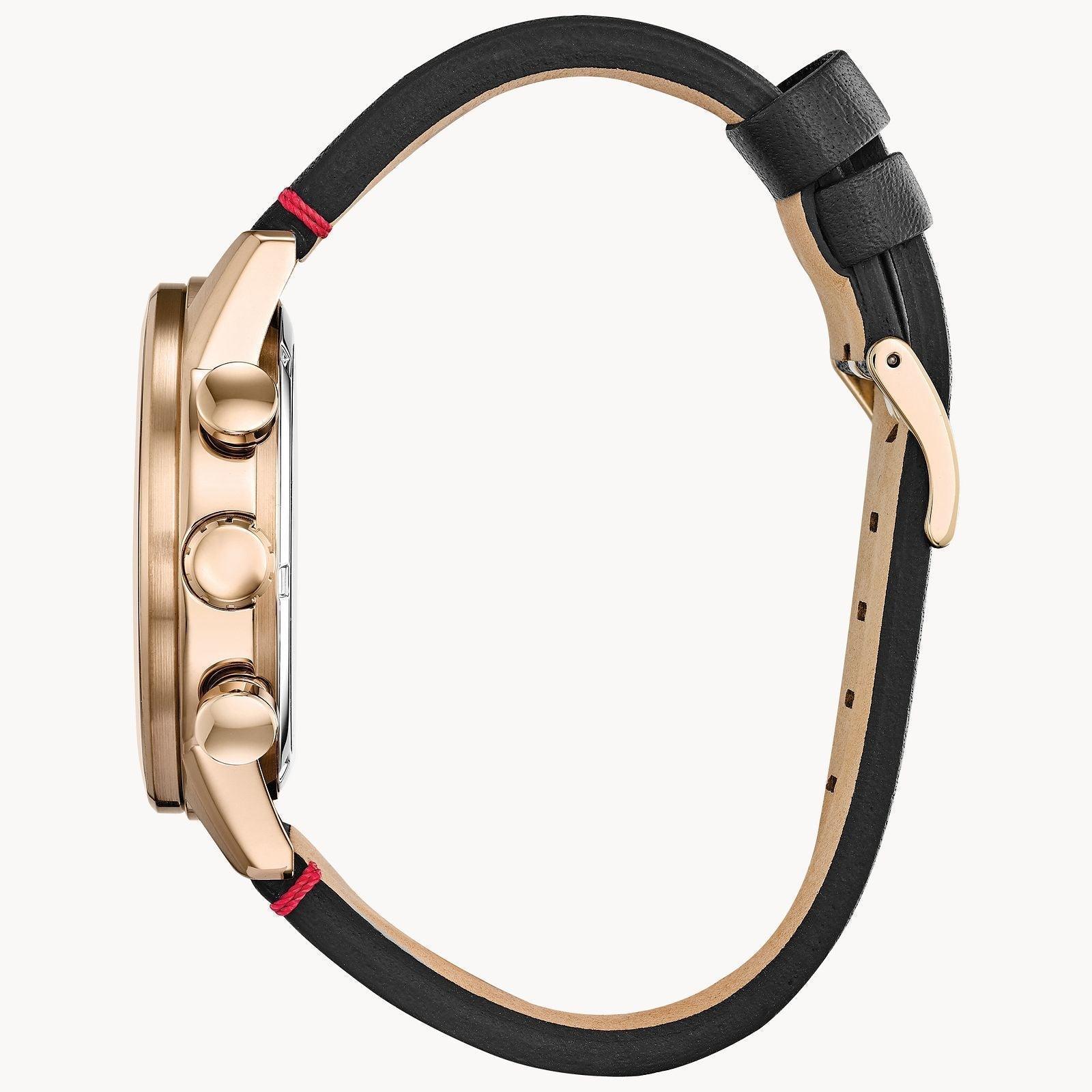 Time to hit the racetrack with CITIZEN's reinvented Primo chronograph. A watch that keeps up with your speedy lifestyle and features Eco-Drive technology, making it more than just a solar watch, it's a timepiece powered by any light. Shown in a rose gold-tone stainless steel case, a carbon fibre patterned black leather strap, a jet black dial with bright red accents, a 1/5-second chronograph that measures up to 60 minutes, 12/24-hour time, and date. Case size 45 mm. Water resistant up to 100 metres.