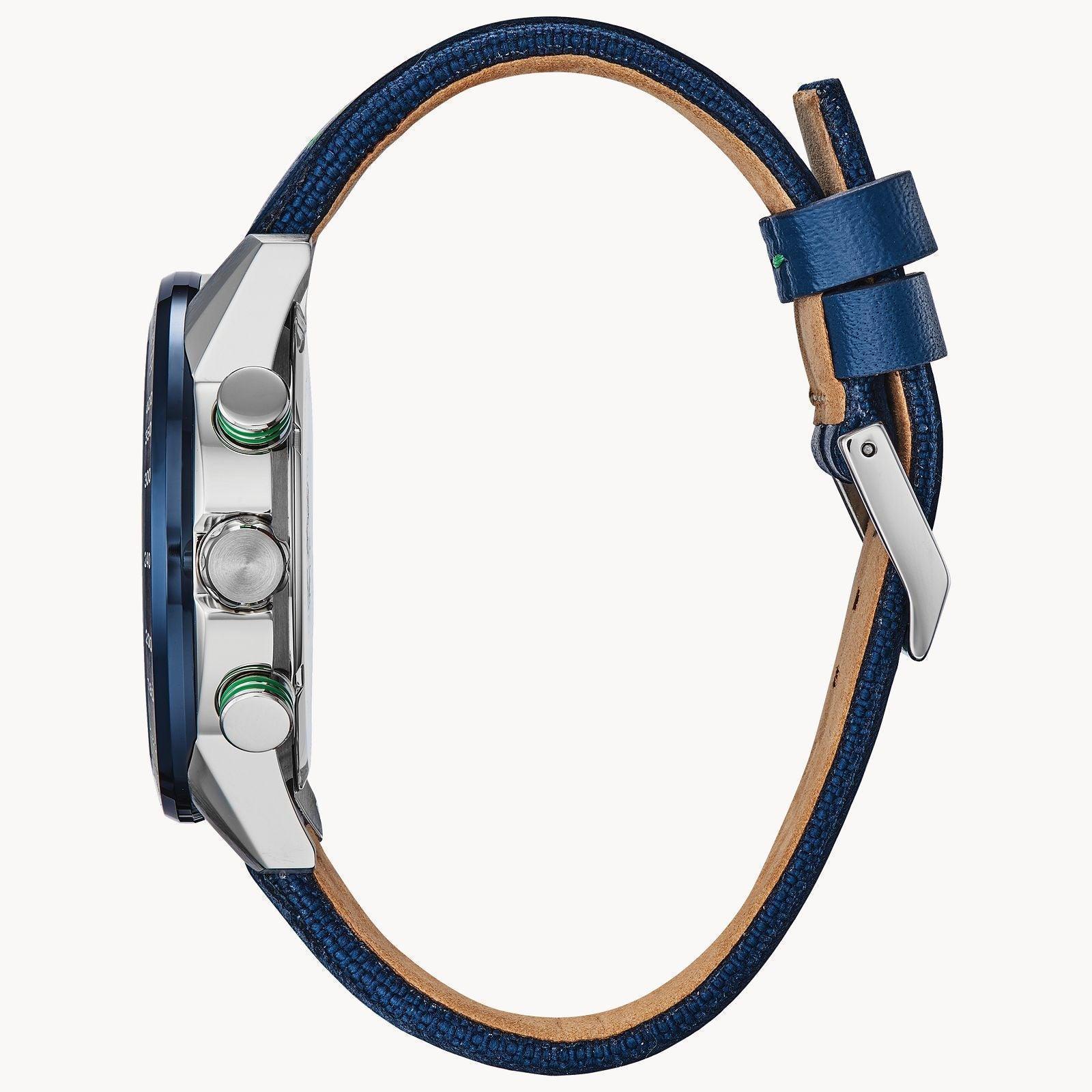 Citizen Eco-Drive round stainless steel case, black leather and nylon strap, blue dial, 1/5-sec chronograph, 12/24-hour time, screw-back case, 44mm case, WR100, buckle.