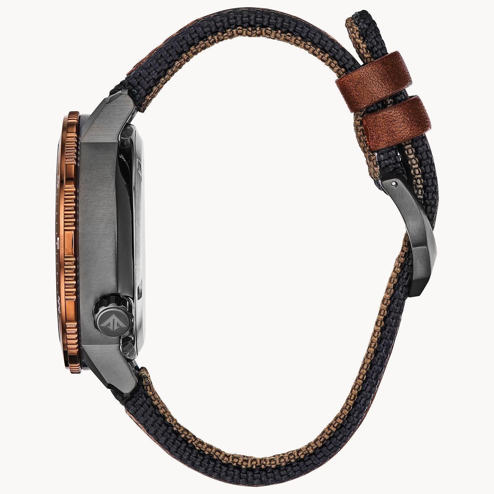 Citizen Eco-Drive round black ion plated stainless steel case, black and brown polyurethane and leather strap, black dial, altimeter, electronic compass, power reserve indicator, rotating compass bezel, screw-back case, anti-reflective crystal. Case size 46 mm. Water resistance up to 200 metres.