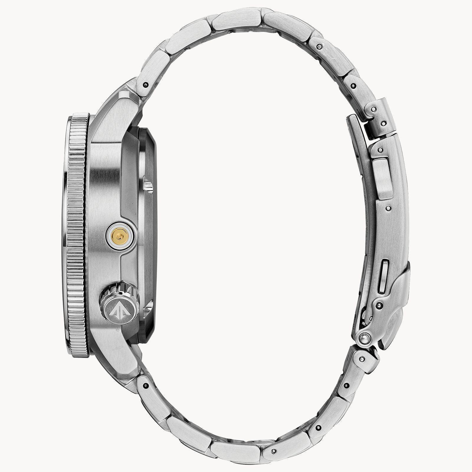 Ready, Set, Dive. An iconic name with a reinvented construction, the ISO compliant CITIZEN PROMASTER Aqualand watch with maximum depth memory, rapid ascent alarm, auto start dive mode, power reserve indicator and date is water resistant up to 200 metres. You won't want anything else when headed to the ocean. Stainless steel case and bracelet compliment the black dial with bright orange bezel. Featuring our Eco-Drive technology powered by light, any light. Never needs a battery. Case size 46 mm.