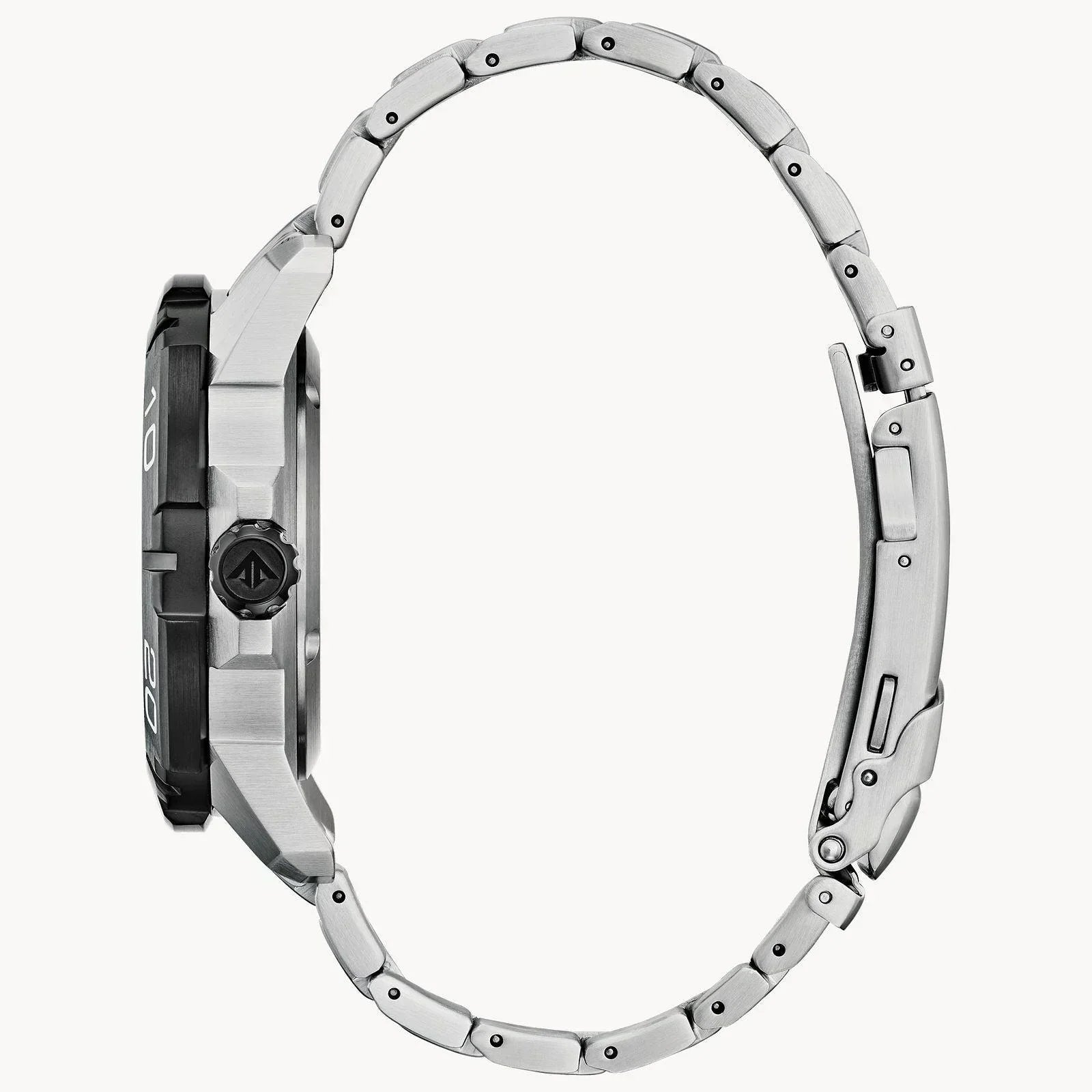 Citizen Promaster Eco Drive Men's Stainless Steel Blue Red Inner Bezel Quartz Analog Watch - BJ7128-59E. A fully-featured dive watch with a splash of color, the Promaster GMT Diver with Eco-Drive technology from Citizen is the total package. The stainless steel band and black dial are accented with red and blue for a bold look that stands out from the crowd. This timepiece features an anti-reflective sapphire crystal face, dive grade luminous hands and markers, anti-shock, anti-magnetic, dual time and a rotating bezel. Citizen Men's Promaster Diver Eco-Drive Watch. Stainless steel with ion plated bezel accented in red and blue. Features Dual Time and Luminous hands and markers with an Anti-Reflective Sapphire Crystal. And because it is Eco-Drive, it will charge by any light source indoors or out and will never need a battery. Case size 44 mm. Water resistant at 200 meters.