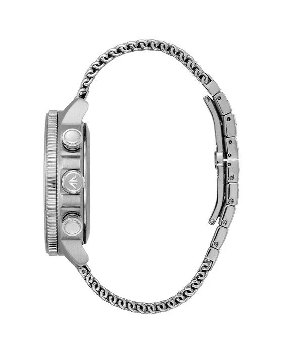 Stainless steel case with a silver-tone stainless steel mesh bracelet. Fixed stainless steel bezel. Black dial with silver-tone hands and index hour markers. Minute markers. pilot's rotating slide rule. Dial Type: Analog-digital. Luminescent hands and markers. Perpetual calendar. Chronograph - sub-dials displaying: two - 24-hour digital utc time display. Citizen Caliber Eco-Drive U680 eco-drive movement. Scratch-resistant mineral crystal. Pull/push crown. Solid case back. Round case shape, case size: 48 mm, case thickness: 15.5 mm. Band width: 23 mm, band length: 8 inches. Deployment with push button release clasp. Water resistant at 200 meters / 660 feet. Functions: atomic, perpetual calendar, alarm, date, day, GMT, second time zone, world time, chronograph, hour, minute, second, power reserve indicator. Additional Info: with atomic clock synchronization for superior accuracy, this perpetual calendar chronograph receiving radio sigsuitable for recreational scuba diving. Casual watch style. Watch label: Japan Movt. Citizen Navihawk UTC Eco-Drive Chronograph Mens Watch JY8030-83E.