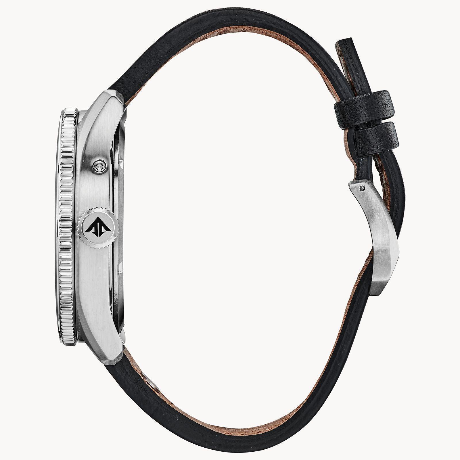 Revamped and reinvented, the antique styled CITIZEN PROMASTER Nighthawk is here to stay. Features include world time in 26 time zones, perpetual calendar, anti-shock and date. Shown here in a stainless steel case, black leather strap with yellow contrast stitching and black dial. Featuring our Eco-Drive technology powered by light, any light. Never needs a battery. Case size 44 mm. Water resistant at 200 meters.