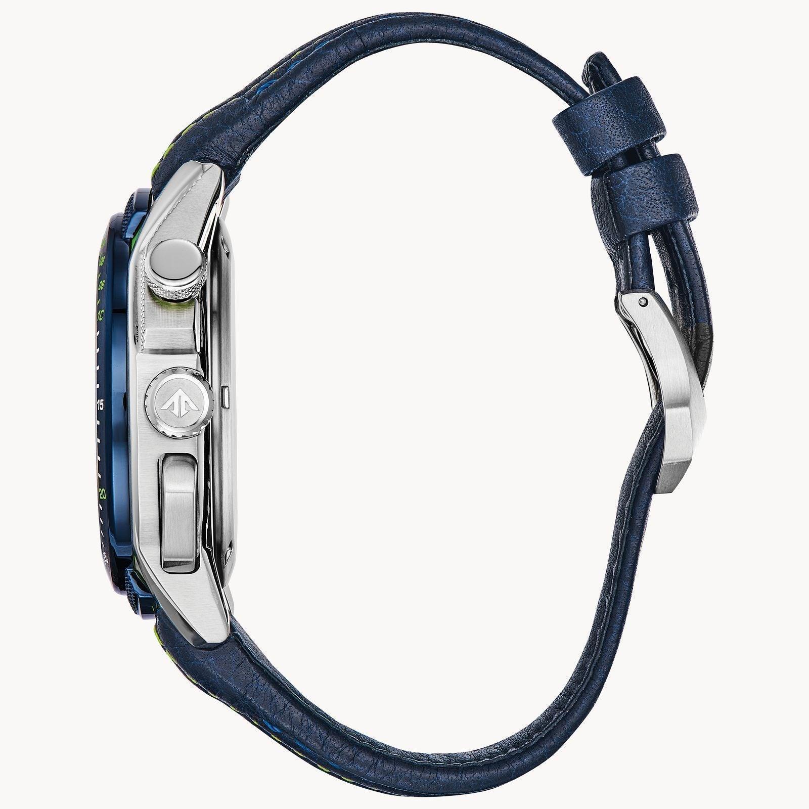 Citizen Eco-Drive round stainless steel case, black leather strap, black dial with blue accents, 1/1000th sec chrono, world time, alarm, 99min countdown timer, perpetual calendar, sapphire crystal, screw-back case. Case size 46 mm. Water resistance up to 200 metres, buckle.