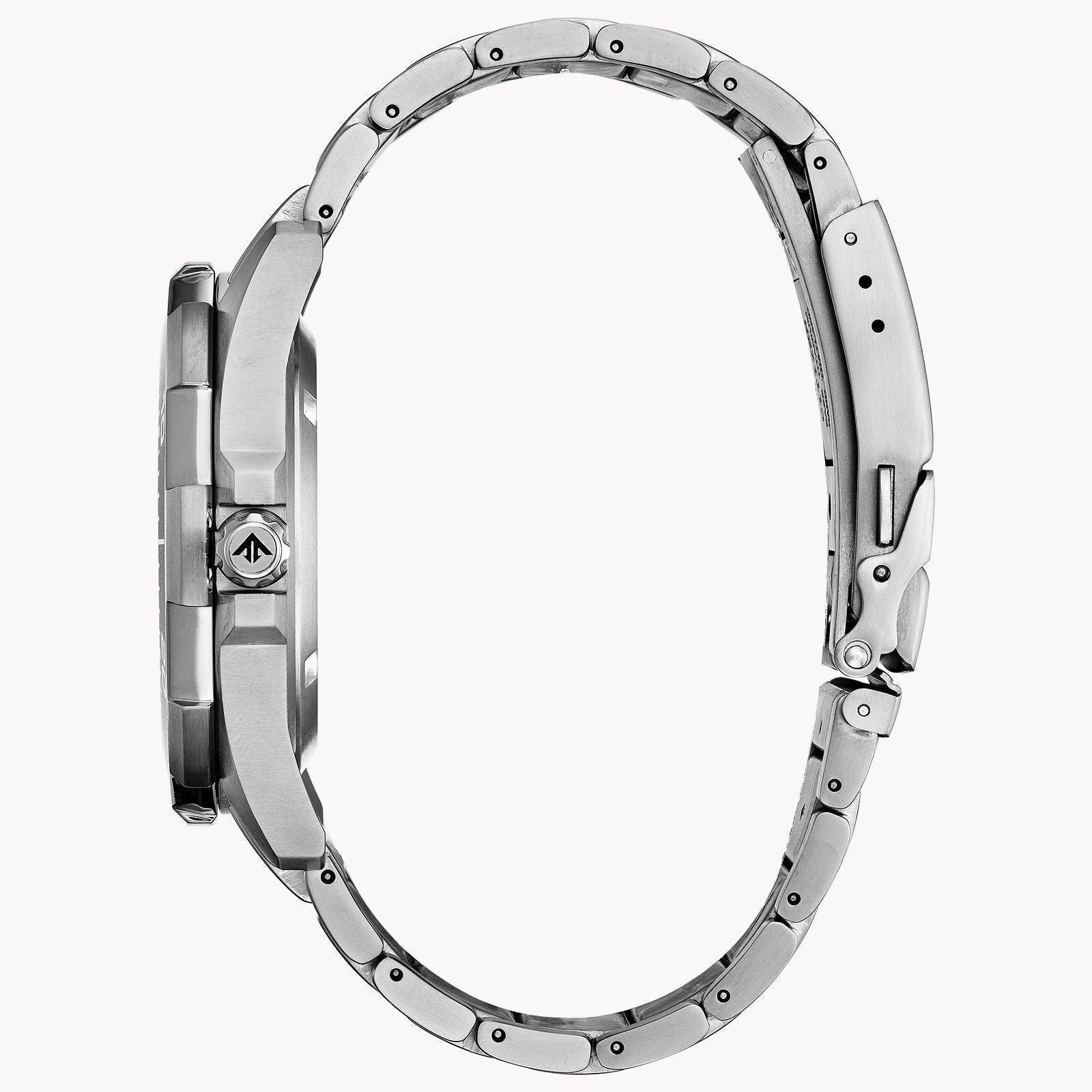 Silver-tone super titanium case with a silver-tone super titanium bracelet. Uni-directional rotating black bezel. Black dial with silver-tone hands and index hour markers. Dial Type: Analog. Luminescent hands and markers. E168 eco-drive movement. Scratch resistant mineral crystal. Screw down crown. Solid case back. Round case shape. Case size: 44 mm. Safety fold over with push buttons clasp. Water resistant at 200 meters / 660 feet. Functions: date, hour, minute, second. Citizen Promaster Diver Luminous Mens Watch BN0200-56E.