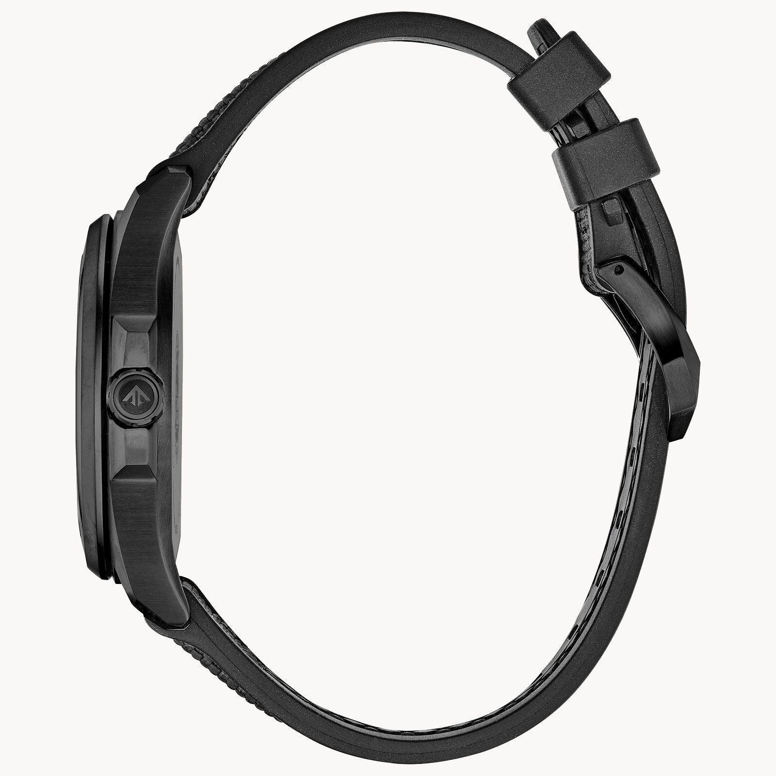 Test the extremes with the CITIZEN PROMASTER Tough series. Living up to its name, this timepiece features a monocoque case (2 piece construction resulting in no caseback) providing extreme rigidity and shock resistance. Shown in a stainless steel case coated in CITIZEN's Proprietary Surface Hardening Technology (Duratect), making it harder and more scratch resistant than stainless steel. Other features include a black genuine Cordura Ballistic fabric and polyurethane strap, an anti-magnetic movement, anti-reflective sapphire crystal, and luminous hands and markers. Featuring our Eco-Drive technology powered by light, any light. Never needs a battery. Case size 42 mm. Water resistant at 200 meters.
