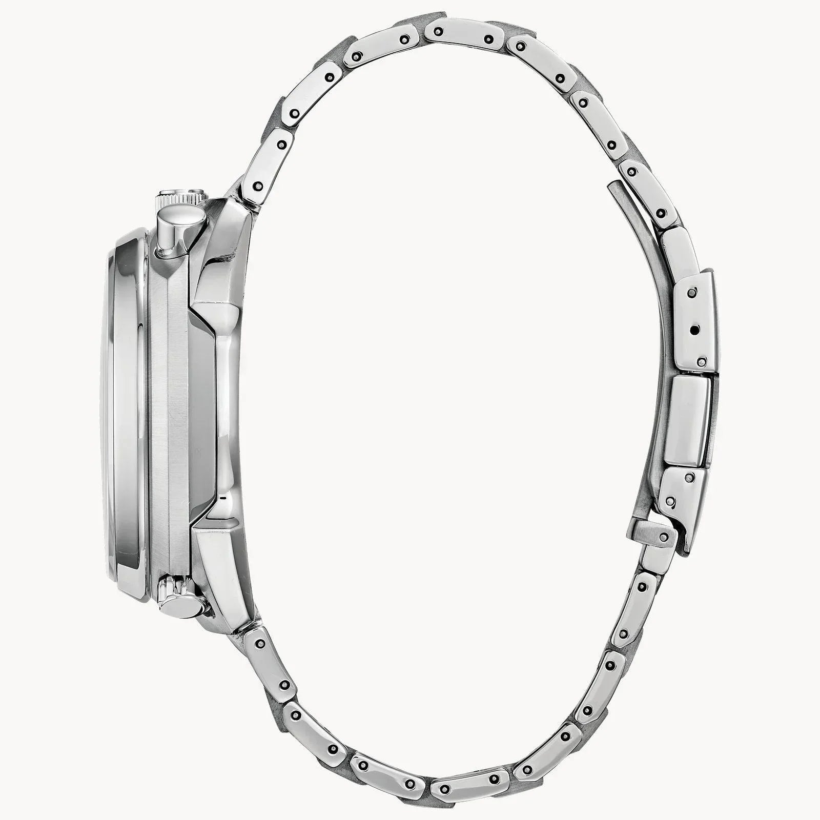 Paying homage to a retro 1973 CITIZEN Bullhead model, the newly modernized CITIZEN PROMASTER Tsuno Chrono Racer showcases a unique case styling, trendy colour combinations and is sure to stand out on your wrist. With its hand assembled movement, it features a 1/5-second flyback chronograph measuring up to 12 hours, an alarm, a power reserve indicator, a tachymeter, a screw-back case, and sapphire crystal. Shown here in a stainless steel case and bracelet with an azure and black dial. Featuring our Eco-Drive technology powered by light, any light. Never needs a battery. Case size 45 mm. Water resistant up to 200 metres.