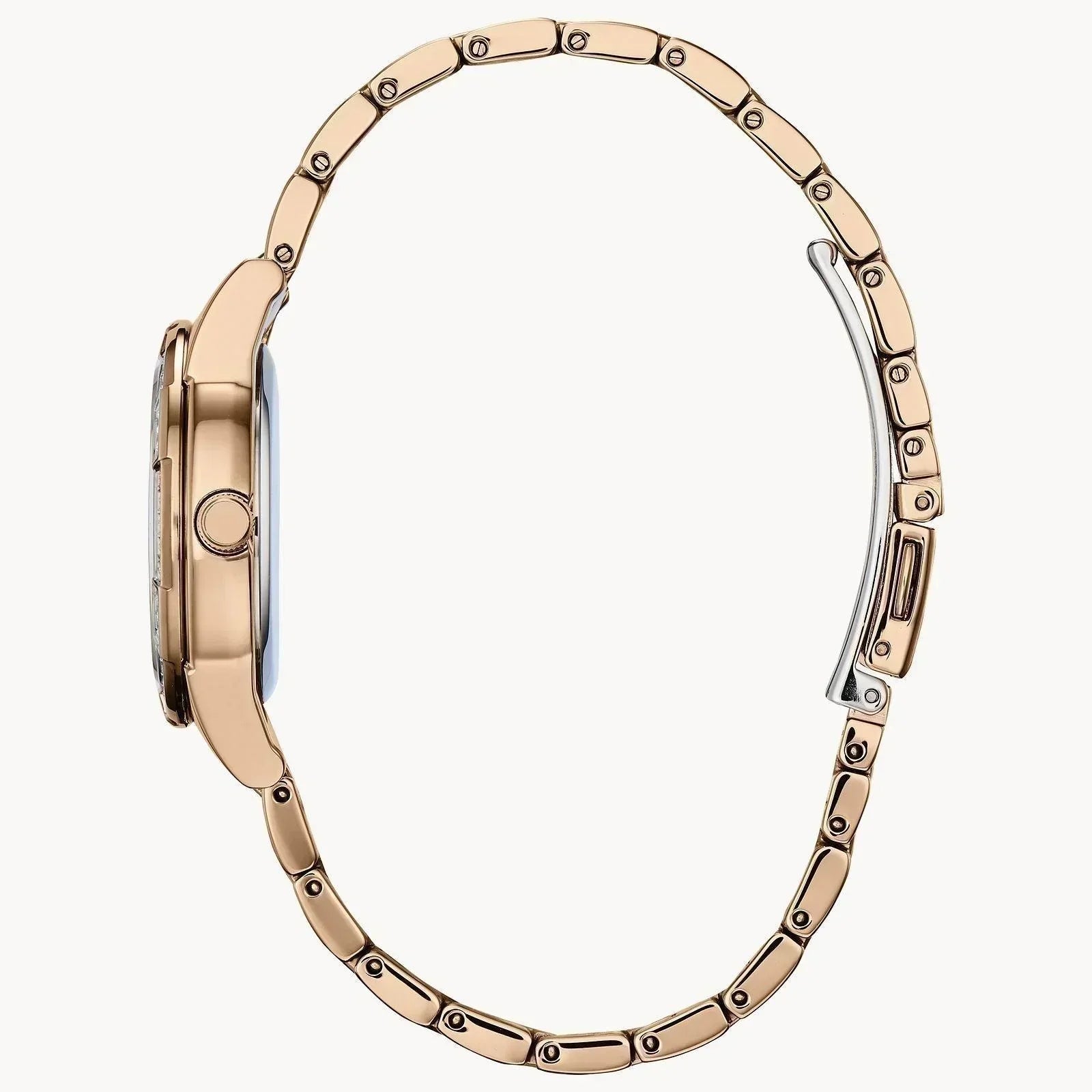 Citizen Eco-Drive round rose gold-tone stainless steel case and bracelet, mother-of-pearl dial, Swarovski crystal accents, Cabochon crown, 31mm case, WR50, fold over clasp with push button.