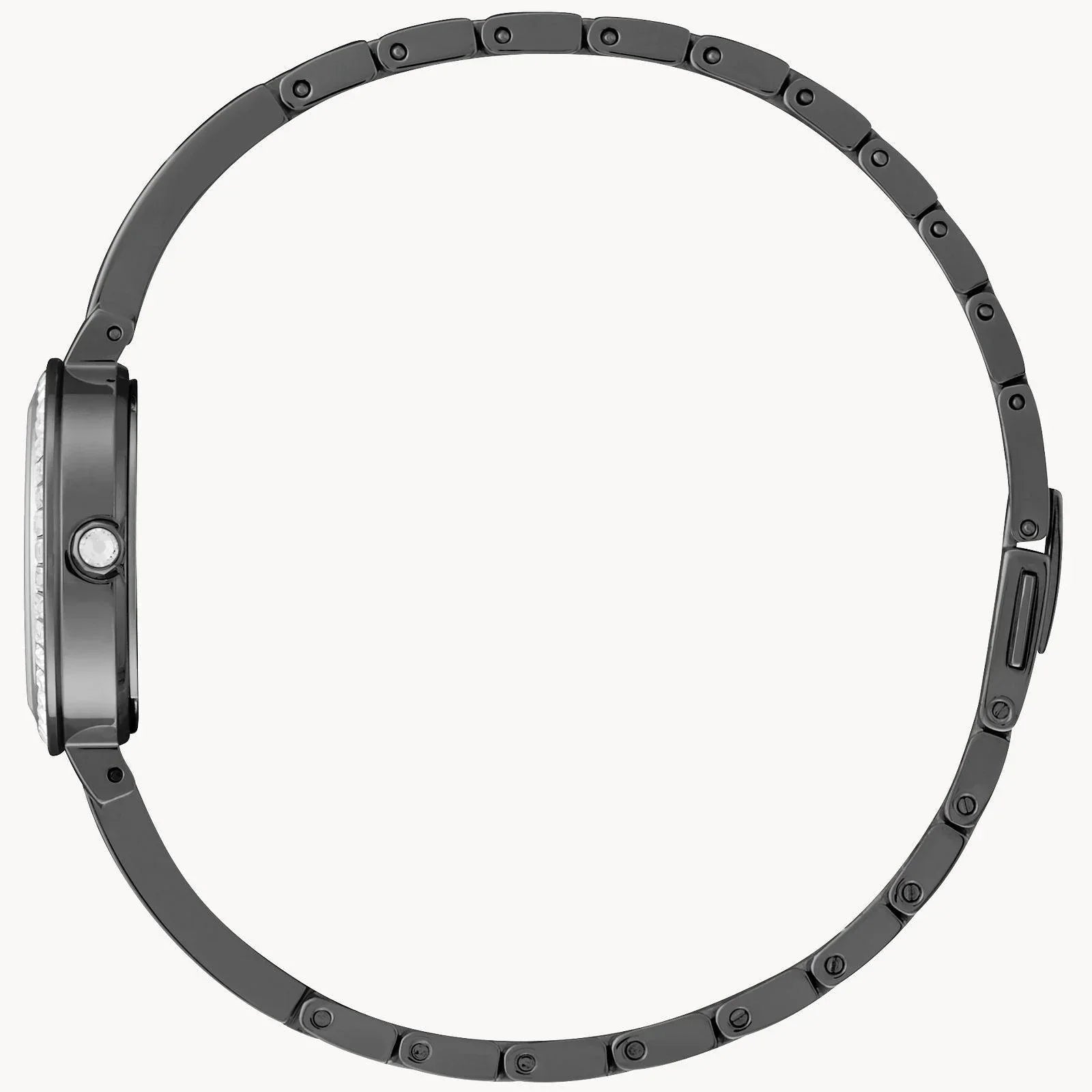 Citizen Eco-Drive round black ion-plated stainless steel case and bracelet, black dial, Swarovski crystal accents, 25mm case, WR50, JLP.