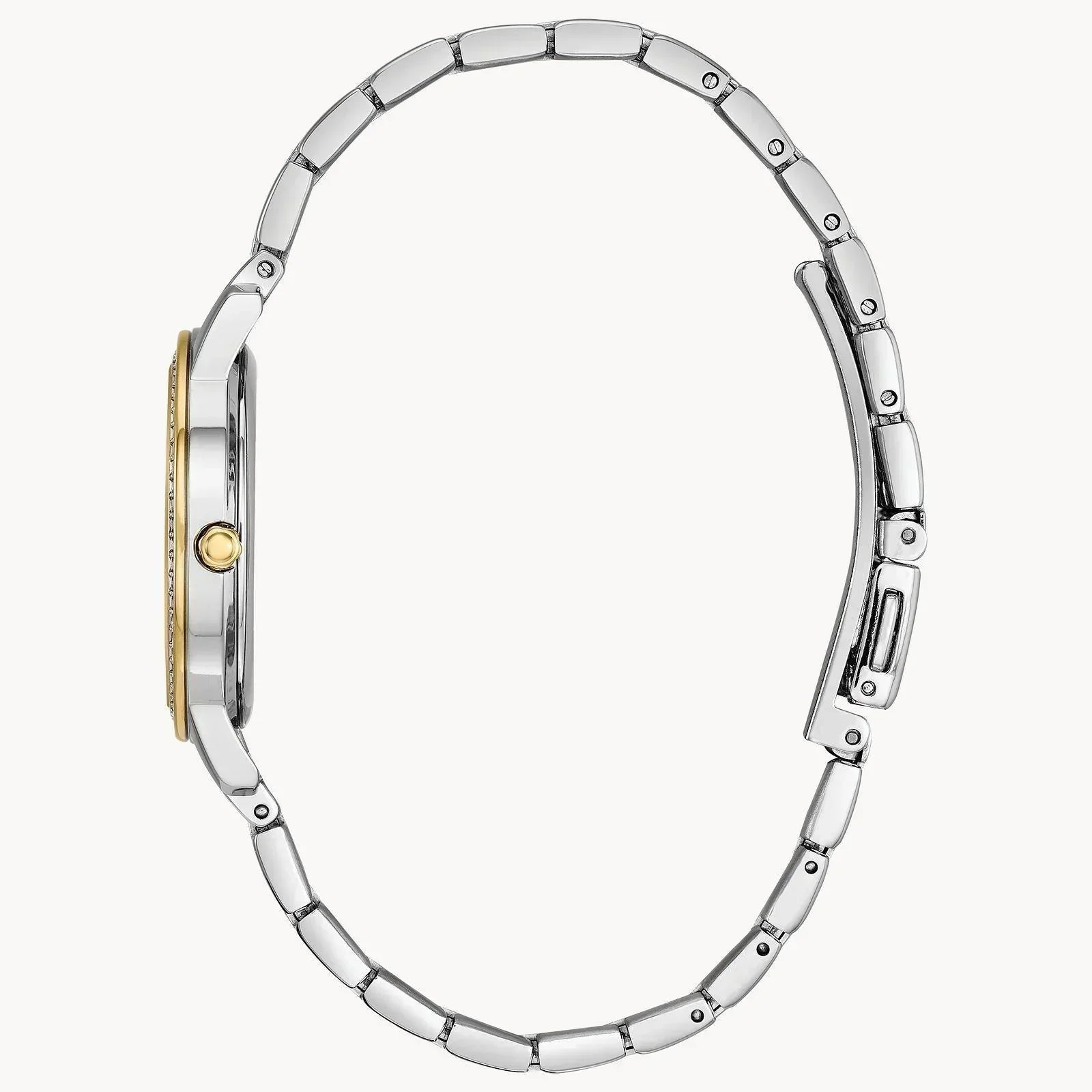 Give your outfit of the day a touch of sparkle with this beautiful CITIZEN Silhouette Crystal timepiece. Shown in a two-tone stainless steel case and bracelet, this timepiece adorned with Swarovski crystals, is crafted with a ripple motif on its Mother-of-Pearl dial and also features a sapphire crystal. Case size 29 mm. Water resistant up to 50 metres.