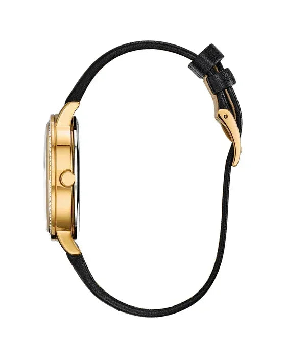 CITIZEN Silhouette Crystal - fashionable, precise and powered by light - creates an appeal unlike any other. Decorated with Swarovski crystals and shown here in gold-tone stainless steel case and sleek black leather strap with a Mother-of-Pearl dial. Featuring our Eco-Drive technology powered by light, any light. Never needs a battery. Case size: 36 mm. Water resistant at 50 meters.