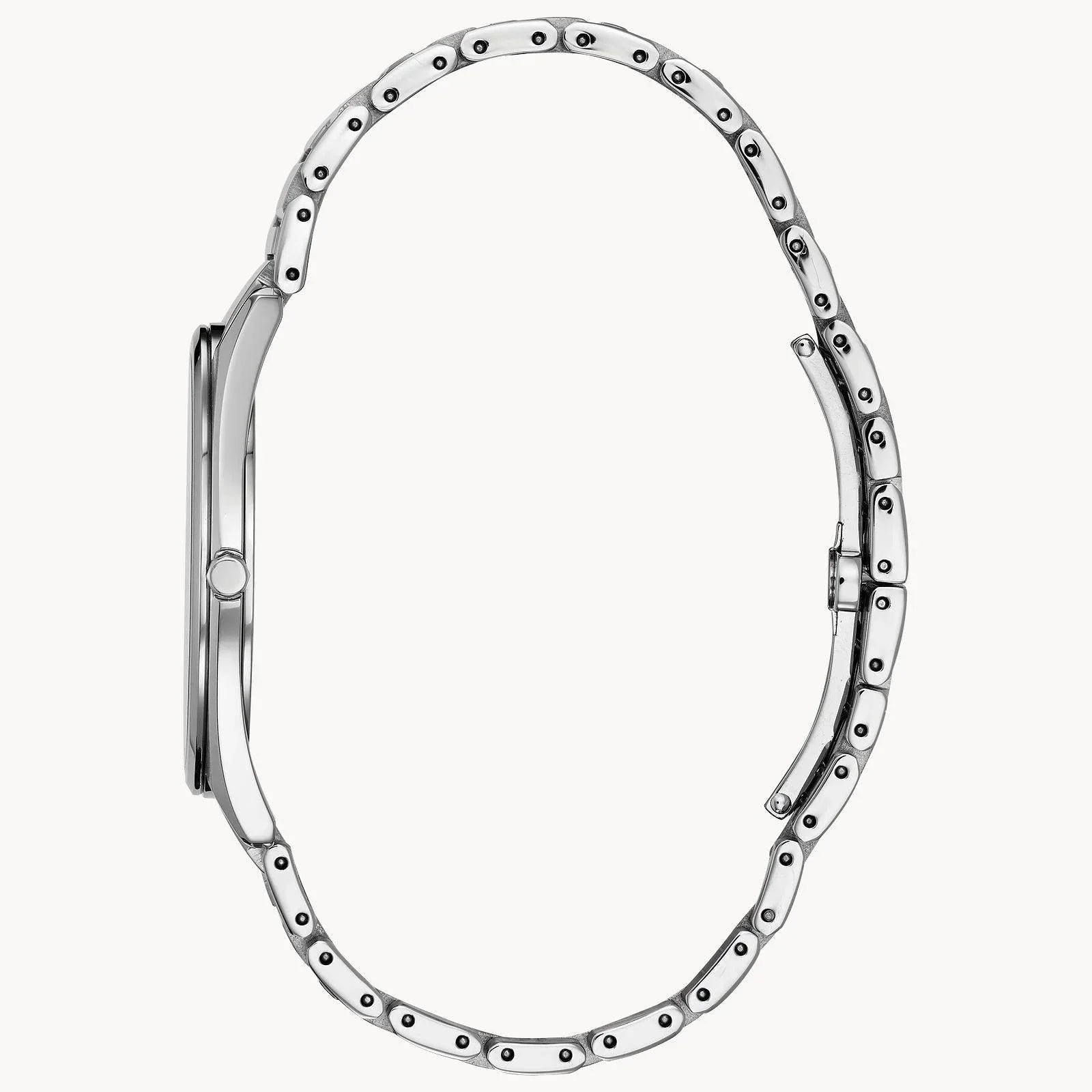 Stainless steel case with a stainless steel bracelet. Fixed stainless steel bezel. Black dial with silver-tone hands and index hour markers. Dial Type: Analog. Eco-drive quartz movement. Scratch resistant sapphire crystal. Pull / push crown. Solid case back. Case size: 38 mm. Case thickness: 4.7 mm. Round case shape. Band width: 21 mm. Deployment clasp with a push button release. Functions: hour, minute. Casual watch style. Citizen Stiletto Eco-Drive Black Dial Stainless Steel Mens Watch