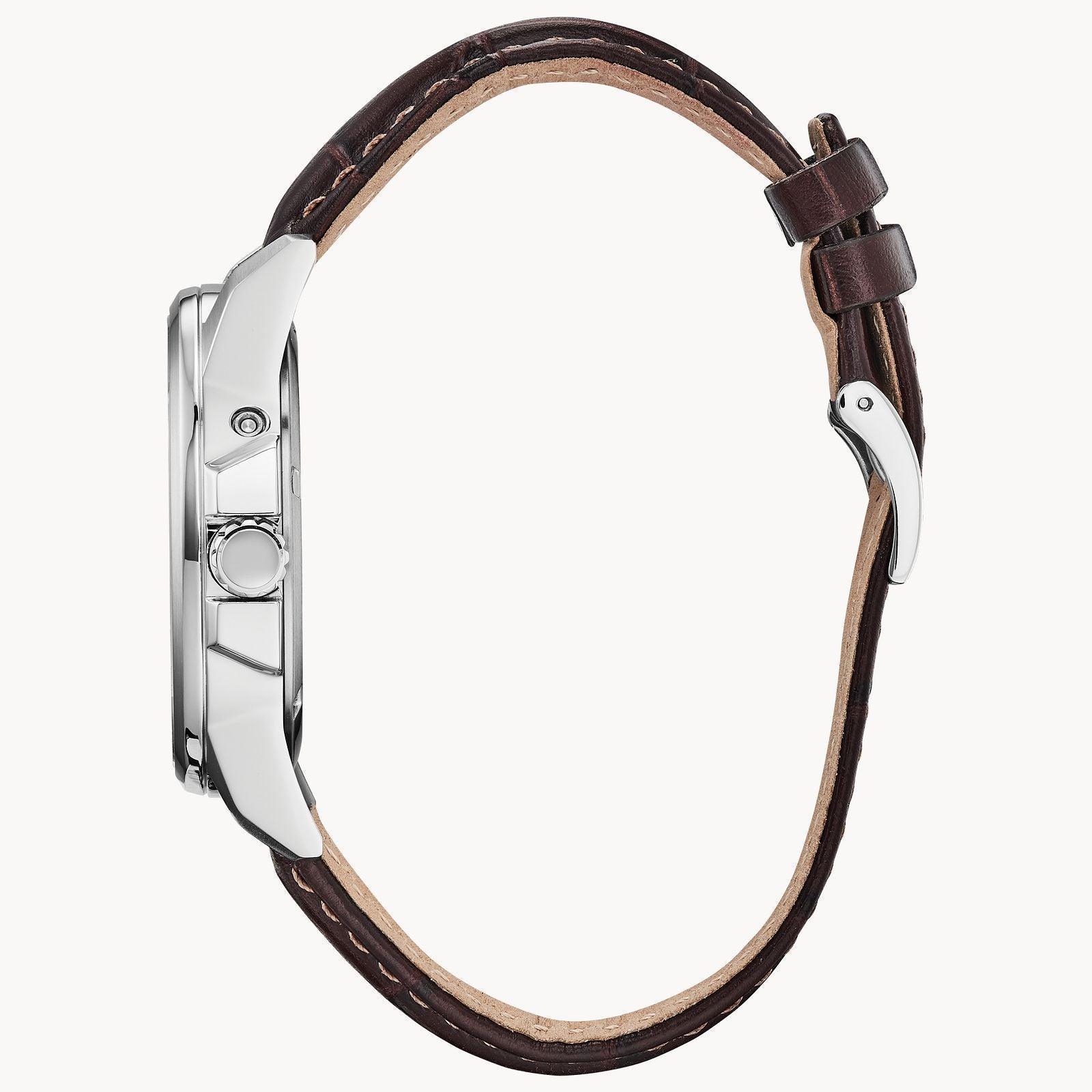 Redefining a classic timepiece with a hint of style, the CITIZEN World Time Perpetual brings about a new confidence. Features include world time in 26 time zones, perpetual calendar and date. Shown here in a stainless steel case, chestnut brown leather strap and midnight blue dial. Featuring our Eco-Drive technology powered by light, any light. Never needs a battery. Case size 41 mm. Water resistant at 50 meters.