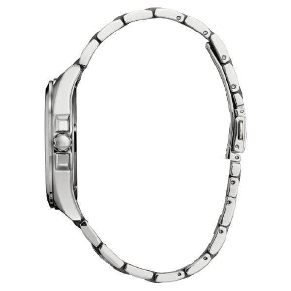 Make a distinctive style statement. Featuring a silver-tone stainless steel case and a green 3-hand dial encased in sapphire crystal, this men’s timepiece is a combination of functional simplicity with a touch of elegance. The silver-tone stainless-steel bracelet has a fold over clasp with push buttons, giving the watch an understated refinement. Water resistant to 100 metres and sustainably powered by any light with Eco-Drive that never needs a battery.