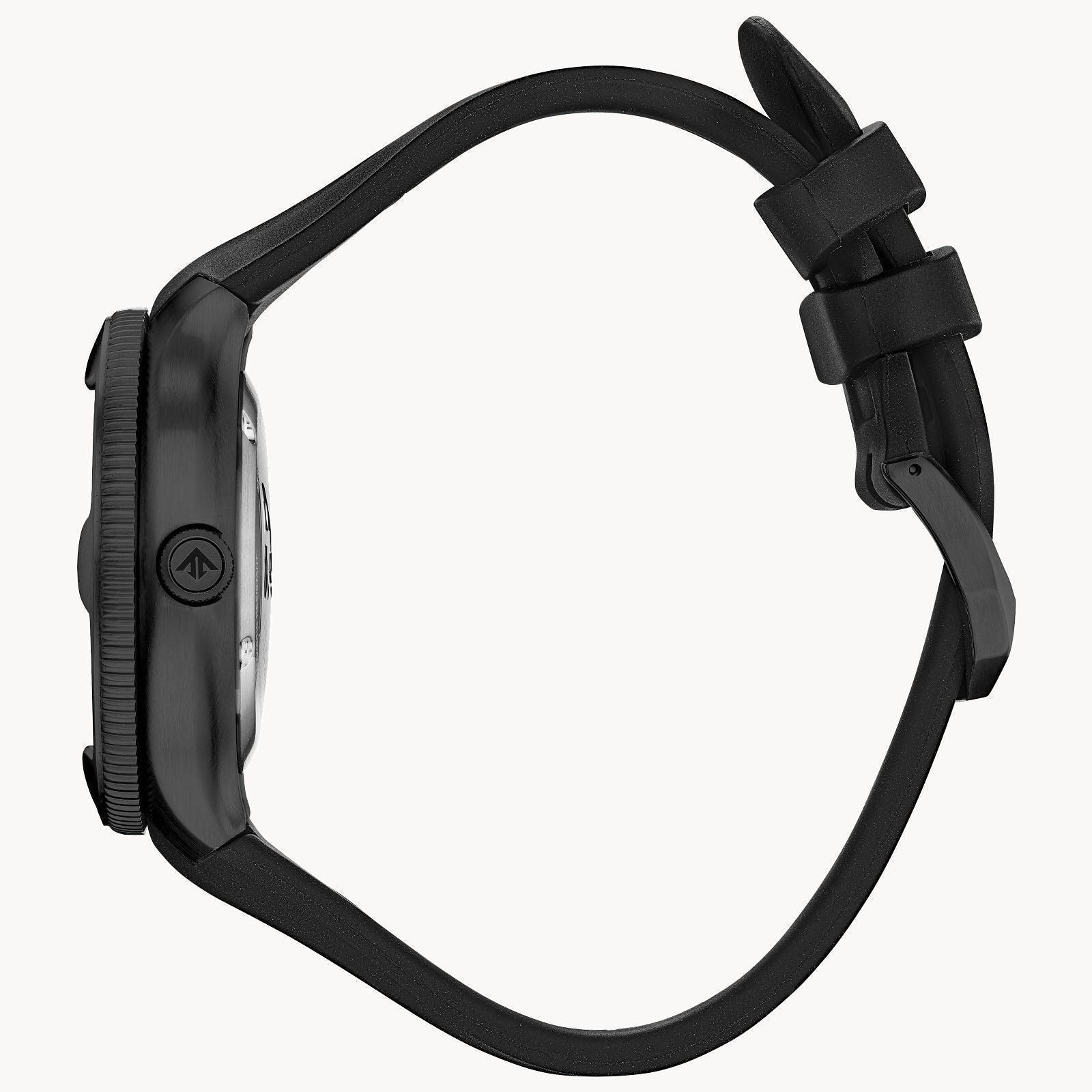 Citizen Eco-Drive round black-ion plated stainless steel case and black PU strap, black dial, ISO Compliant, screw-back case, screw-down crown, date, 46mm case, 200M, buckle.