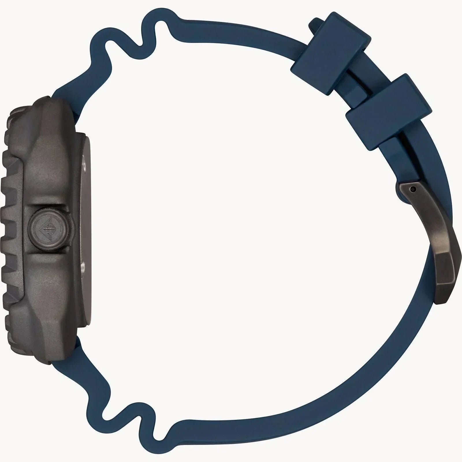 Citizen Eco-Drive round super titanium case and blue PU strap, blue dial, ISO Compliant, screw back case, date, 47mm case, 200M, buckle.