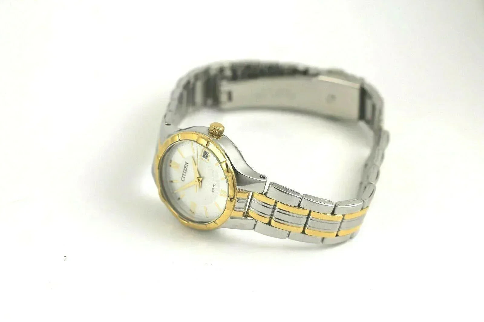 This Citizen quartz watch makes her must-have list. Crafted in two-toned stainless steel, this quality timepiece features a 25mm case, white patterned dial, date display, sculpted gold-toned bezel, gold-toned hands and Roman numeral markers, and second hand. The two-toned link bracelet secures with a fold-over clasp. Ensuring accuracy, the reliable quartz movement keeps you right on time. Water resistance up to 50 metres.