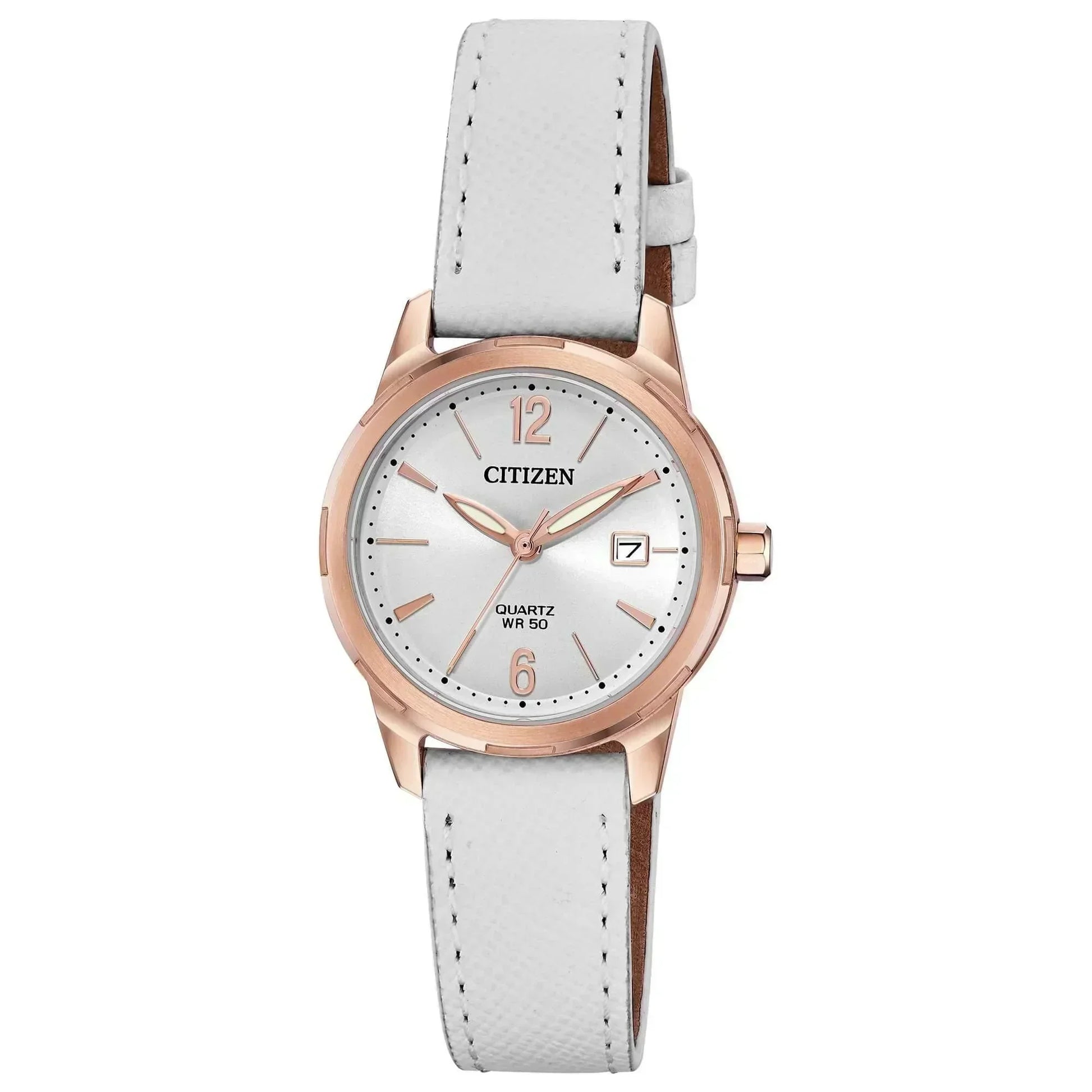 Citizen Quartz round pink gold-tone stainless steel case, white leather strap, silver-tone dial, 28mm case, WR50, buckle.