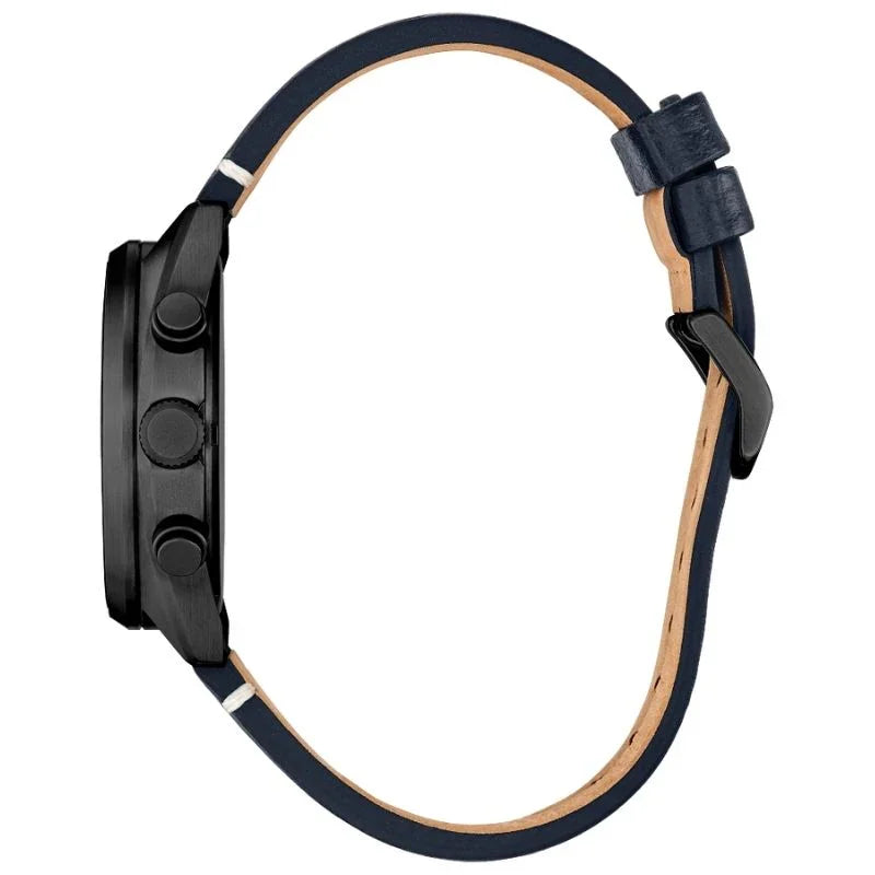 Take action and show your inner drive with the versatile styling of the latest Sport Casual chronograph. The watch features a 41mm black ion-plated stainless steel case with modern, stepped-pushers and a deeply knurled crown. A sandblasted finish adds to the watch's sporty charm, with it secured to the wrist with a navy leather strap. On the blue dial, an aviation-inspired chronograph design is at work, featuring white accents and a 3 o'clock date window. Featuring our Eco-Drive technology – sustainably powered by light, any light. Never needs a battery. Water resistant up to 100 meters. Calibre number B642.