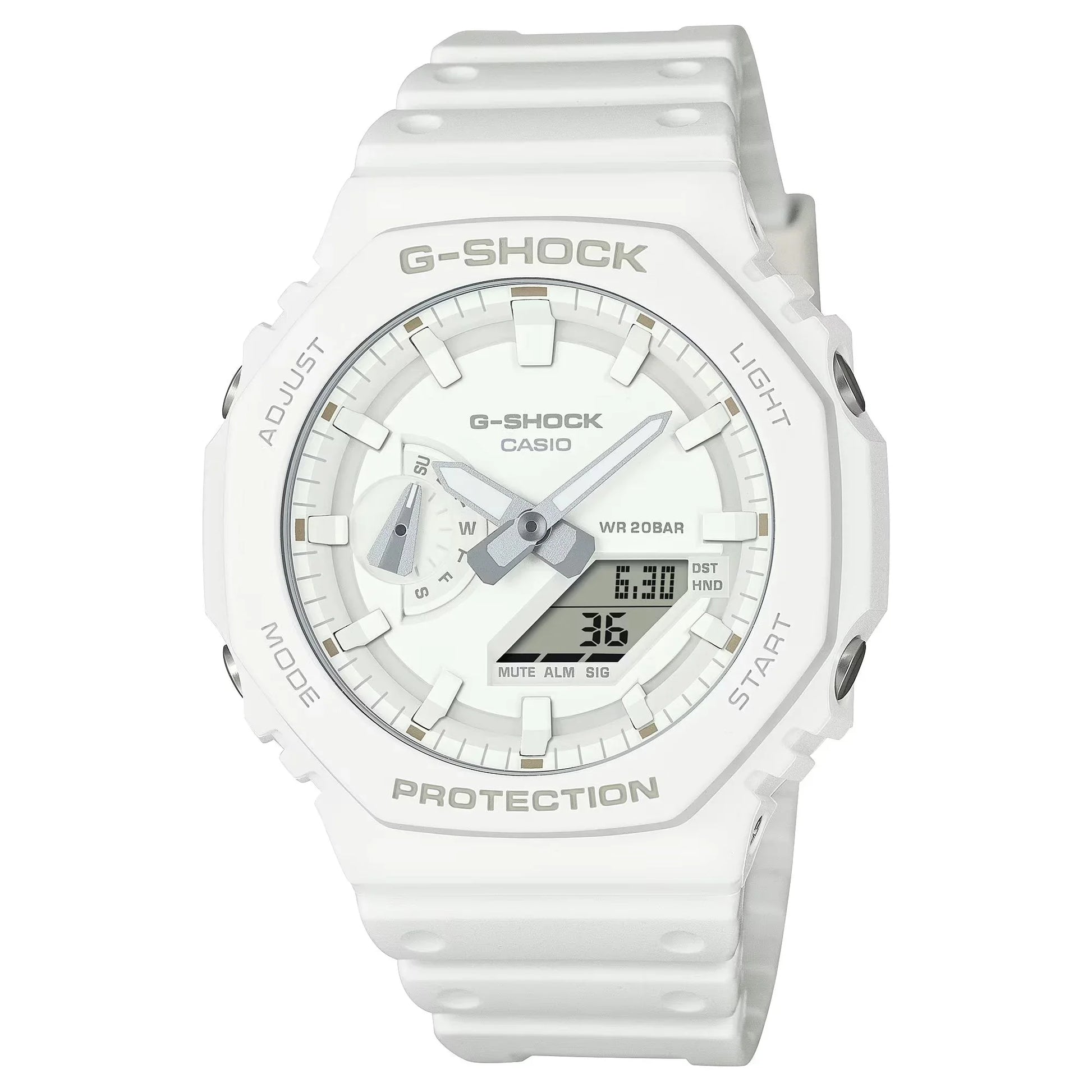 The White Analog-Digital GA2100-7A7— Modernity Meets Performance Make an elegant monochromatic statement with the white G-SHOCK GM2100-7A7. The incredibly popular GA2100 burst onto the scene in 2019, and with the white tone-on-tone GA2100-7A7, we’ve cast the popular GA2100 with subtle shades of classic white to give the GA2100 line an analog-digital watch that declares its sophistication while offering industry-leading performance. The classic white of the GA2100-7A7 not only adds an element of sophistication, but its monochromatic purity carves out its distinct character from other white G-SHOCK watches. Our GA2100 watches are built with a shock resistant, Carbon Core Guard structure, and its incredible durability is further enhanced with 200-meter water resistance. The watch also utilizes two LED lights—one for the watch face, the other for the digital display—to ensure an easy read in the dark. The bezel and band of these watches are made with bio-based resin produced from renewable organic resources, a material expected to help curb CO2 emissions and otherwise reduce environmental impact. White not your fancy? Take a look at the GA2100 in brilliant yellow or a serene light blue.