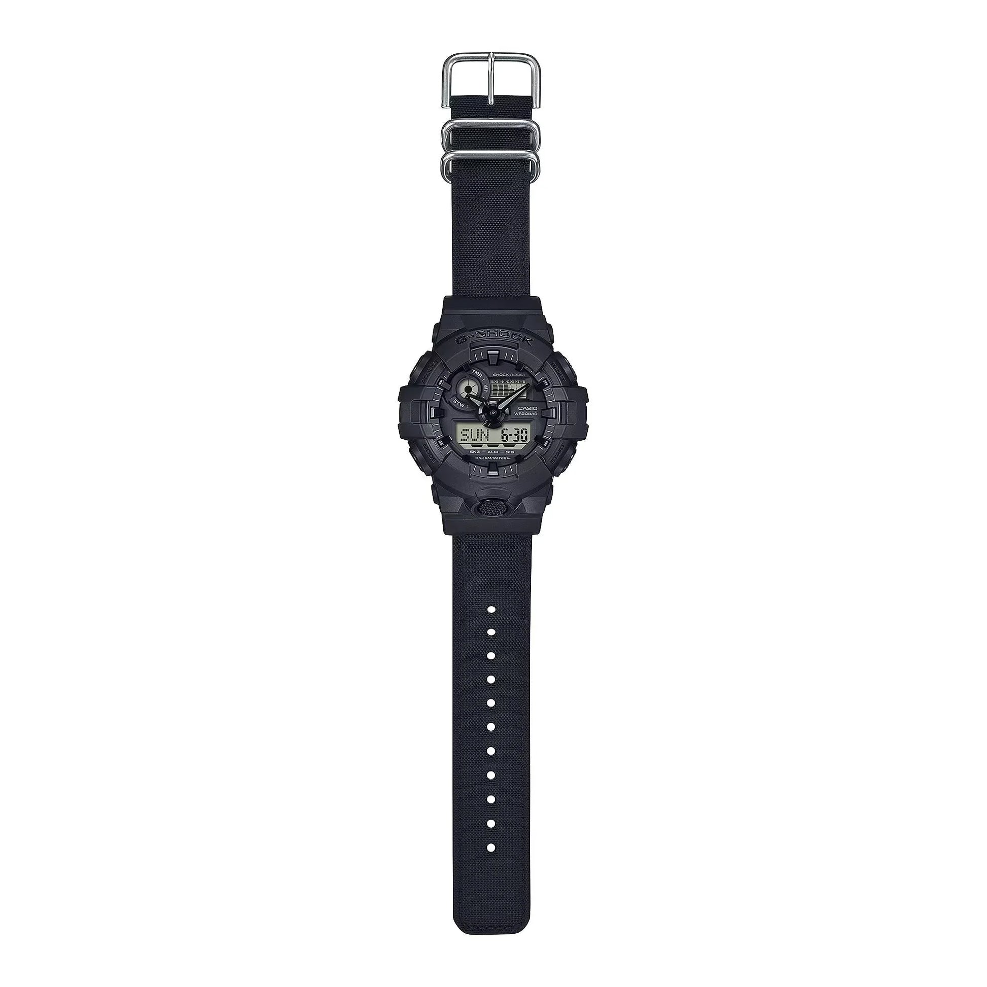 The GA-700BCE-1A by G-SHOCK is a digital-analog watch model, equipped with an eco-friendly Cordura nylon band. In all black tones, this G-SHOCK adds a touch of street-smart utilitarian style to your wrist. This all black model boasts subtle grey details through the face and bezel, gently highlighting the watch hands and minute marks around the bezel. Be prepared for any event with the GA-700BCE-1A as your primary timepiece and wrist accessory – work or play, day or night. Selection of G-SHOCK Models with Cordura Nylon Bands