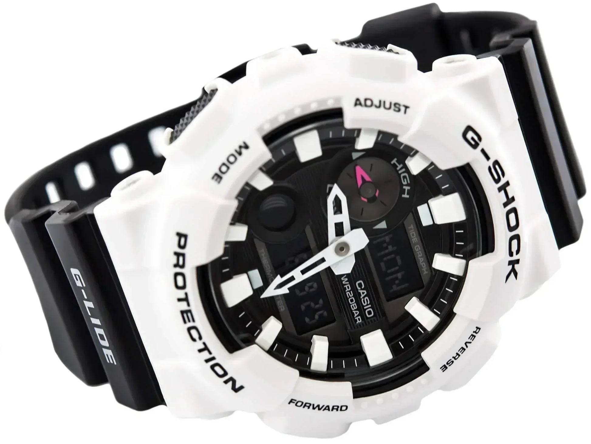 G-SHOCK G-LIDE has long been a favorite choice among the world's top surfers and street sports athletes, and these new additions for 2016 promise to maintain that tradition. The new GAX-100 combination model provides the best of both analog and digital formats. Large hour markers, hour hand, and minute hand contribute to easy reading. The arrow shaped minute hand and the contrasting color of the analog hands provide at-a-glance readings even while paddling or waiting the next wave. Surfing-oriented functions include Tide Graph, Moon Data, and temperature measurement. 200-meter water resistance. Size of case : 55 x 51.2 x 16.9mm.