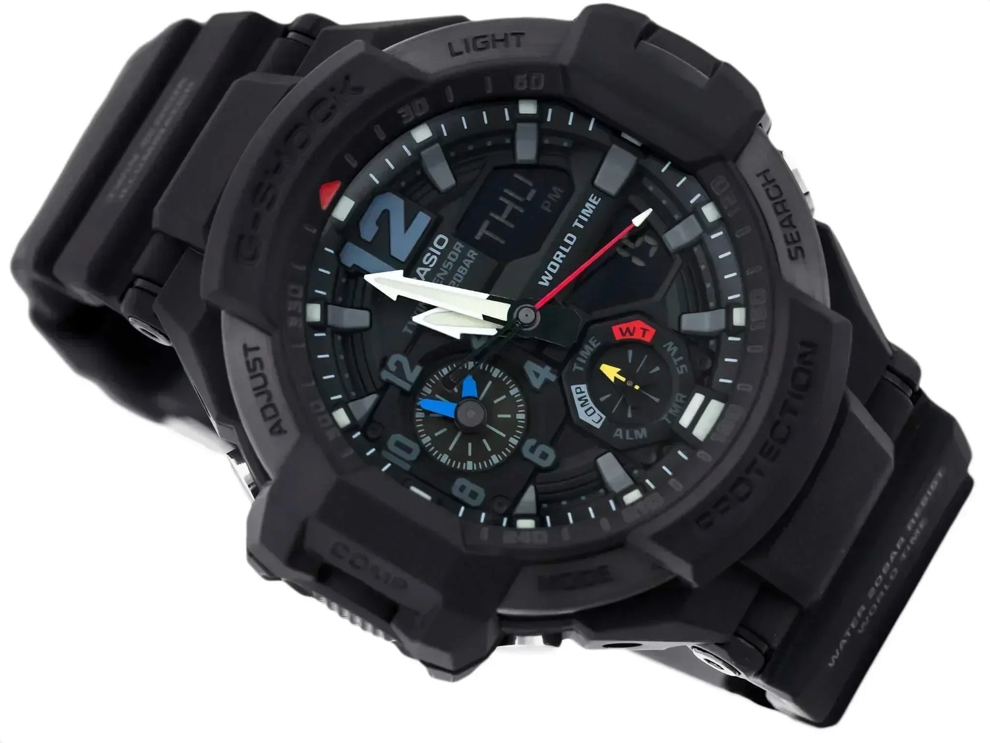 Black resin case with a black resin strap. Black resin bezel. Black dial with silver-tone hands and index-Arabic numerals hour markers. Minute markers around the outer rim. Dial Type: Analog-digital. Luminescent hands and markers. Digital. Casio Calibre 5441 quartz movement. Scratch resistant mineral glass / spherical glass crystal. Solid case back. Round case shape, case size: 50.8 x 52.1 mm, case thickness: 16.9 mm. Buckle clasp. Water resistant at 200 meters / 660 feet. Functions: hour, minute, second, digital compass, thermometer, world time, countdown timer, 5 daily alarms, 12/24-hour format, month, date, day. Additional Info: features hand shift feature, 1/100-second stopwatch. Sport watch style. Watch label: Japan Movt. Casio G-Shock Gravitymaster Alarm World Time Black Dial Mens Watch GA1100-1A1.