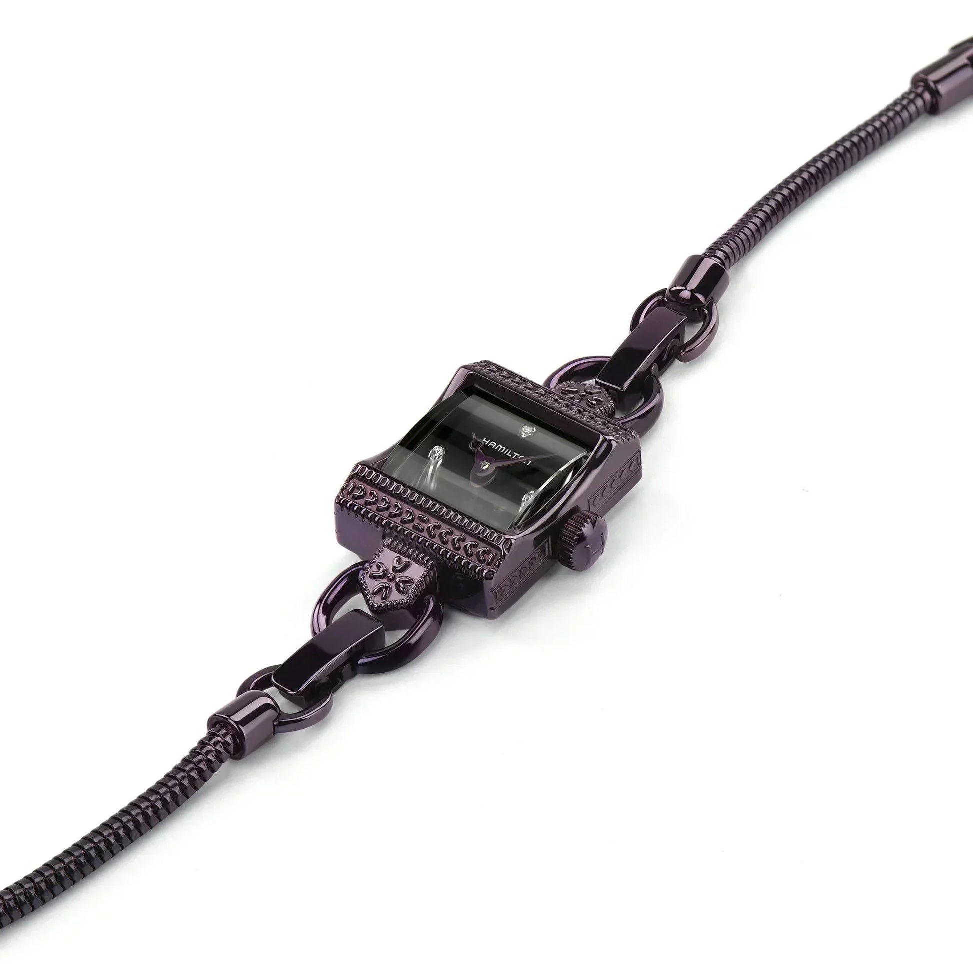 The perfect balance of 1950's charm and contemporary whimsy, the Lady Hamilton Vintage Quartz trades in its traditional metal tones for a warm black and deep plum colored bracelet and case, respectively. Paired with a stunning sunray brushed black dial featuring four sparkling diamonds, this unique watch won't ever fade into the darkness. Quartz movement. Case size 15mm x 19mm. Water resistance upto 50 meters. Sapphire crystal. Folding clasp.