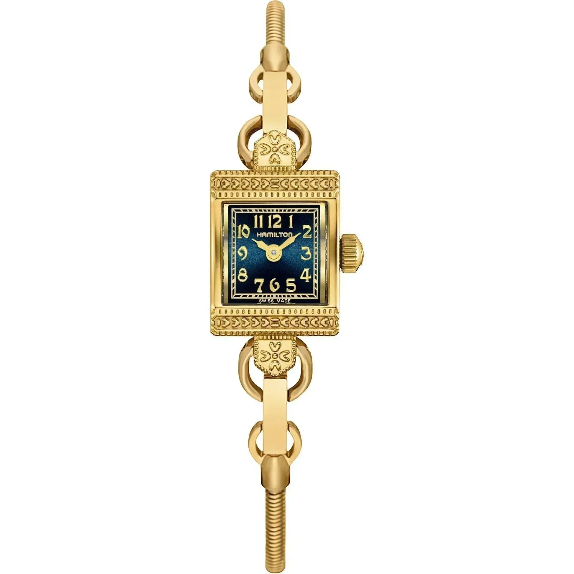 A watch and a piece of jewelry at once, the lady hamilton necklace exemplifies the art deco aesthetic of the 1930's. Featuring a yellow gold PVD coated stainless steel case with an intricate decor and a blue dial, this watch pendant can be worn as a timepiece paired with a chain bracelet or as a part of a necklace with adjustable chain and a fringed tassel pendant in midnight blue. All the set elements come together in special packaging inspired by the era’s iconic geometric patterns.