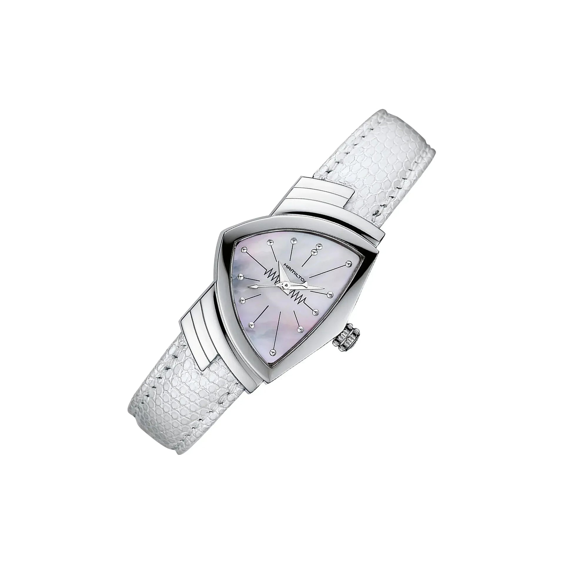 The original Ventura, launched in 1957, made watchmaking history as the world's first electrical, battery powered watch. With its daring and distinctive design, it quickly became an icon and a collector's item. Ventura's latest incarnation is a faithful tribute to the original and mirrors the pioneering shield shaped celebration of Mid-Century Modern design. Stainless steel case with a white leather strap, mother of pearl dial. Quartz movement. Case size 24mm x 36.5mm. Water resistance upto 50 meters. Mineral crystal. Pin buckle.